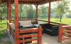 Casa din Livada Puflene - dotata cu un living room, un dormitor cu pat matrimonial, o baie cu jacuzzi si o gradina cu parcare proprie.