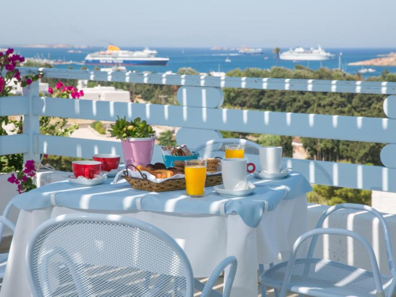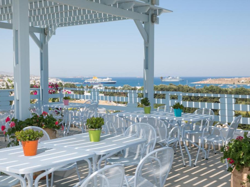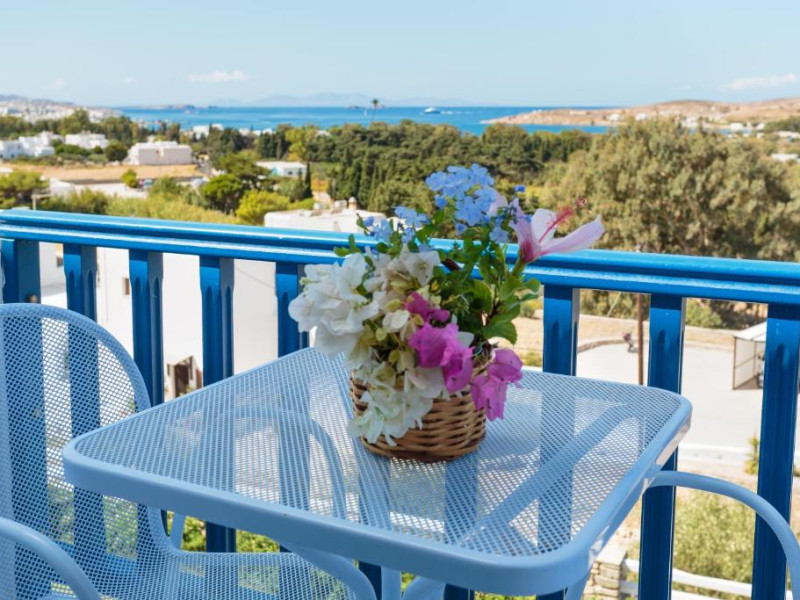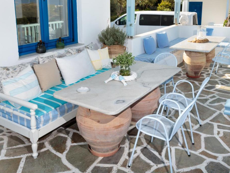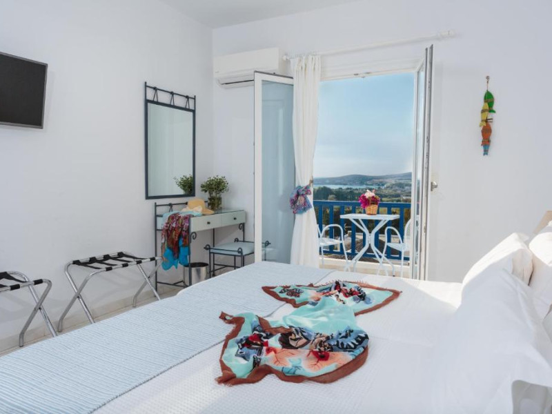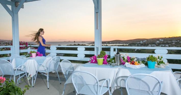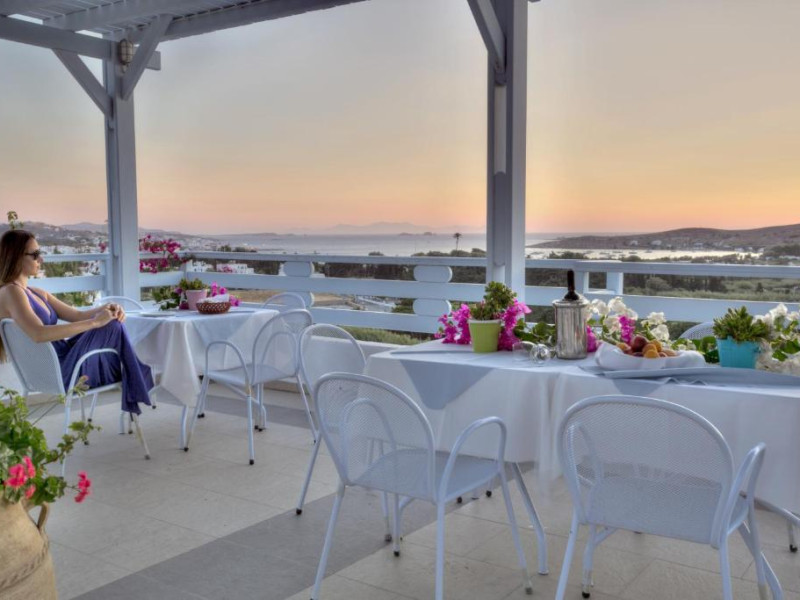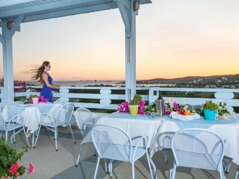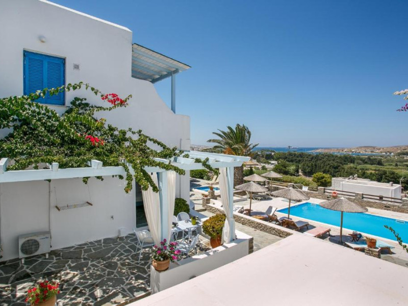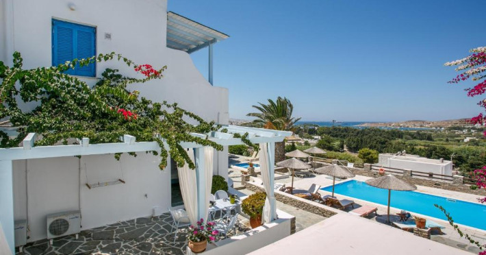 The blue-and-white Pyrgaki Hotel is situated on a small hill, overlooking the port of Parikia. It features sea-view rooms, an outdoor restaurant with a view of Parikia Town, the port and the sea.
