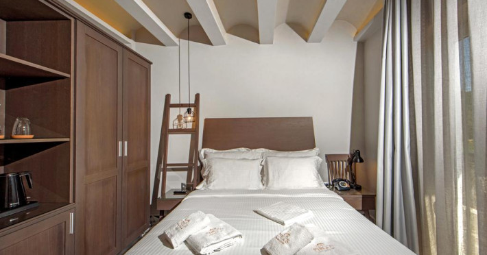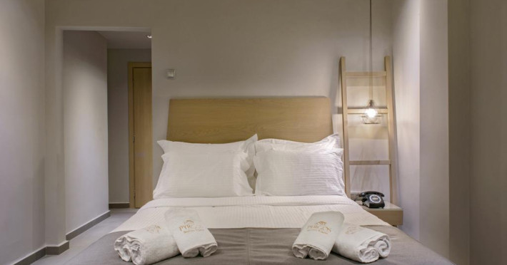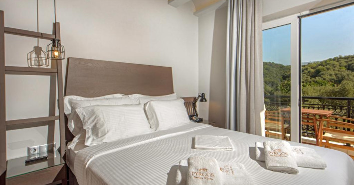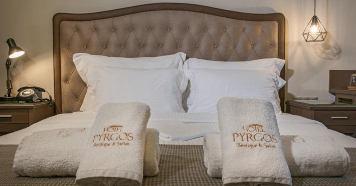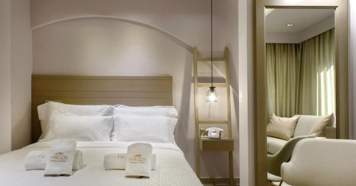 Sunt disponibile 27 camere. În camere există baie cu duș prevăzută cu foehn. Unele camere au balcon cu vedere la grădină sau la piscină. Camerele de la Pyrgos Hotel sunt dotate cu aer condiționat, Tv cu canale prin satelit și seif. Oaspeții au la dispoziție serviciul de room service pentru a servi masa sau diverse băuturi. Oaspeții au acces gratuit la serviciul Wi-fi în camere. Curățenia in cameră se face zilnic. Proprietatea oferă camere pentru familie cu o suprafață mai mare și un număr mai mare de paturi față de cele standard. Se pot rezerva de asemenea camere pentru nefumători.