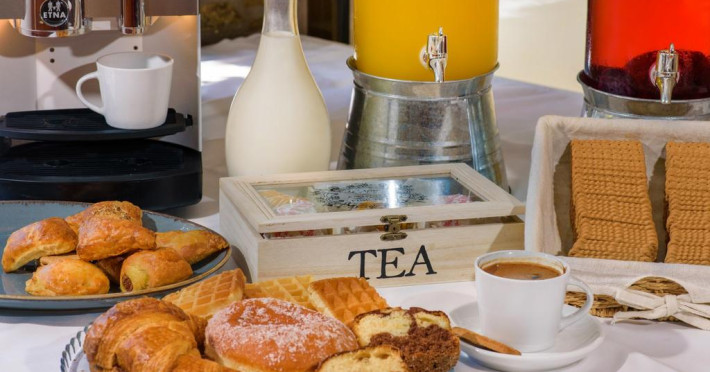 Pyrgos Hotel servește zilnic un mic dejun tip bufet în zona de luat masa. La proprietate există un bar care oferă cafea și diverse băuturi. Acestea pot fi servite atât în interior, cît si în aer liber, pe terasă, în funcție de vreme.