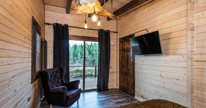 Cabana dispune de 6 camere duble matrimoniale cu baie proprie ce ofera o capacitate de cazare de pana la 15 persoane, o mica bucatarie pentru prepararea cafelei si un living cu elemente decorative sculptate, din lemn masiv. Din living nu putea lipsii semineul, special construit pentru a va aduna in jurul lui.