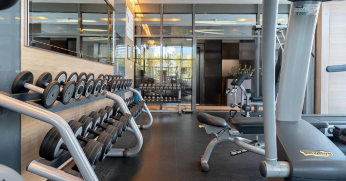 O sală de fitness cu echipamente necesare pentru o gamă variată de exerciții fizice este la dispoziția celor interesați.