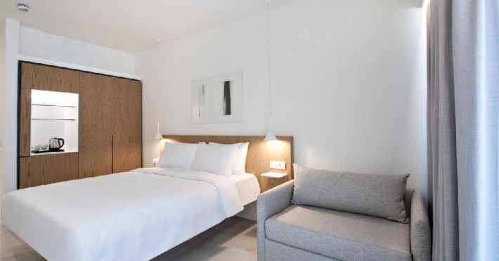 -Superior room sea view - Camera superioara cu vedere la mare, situata la primul etaj, include un dormitor cu pat queen-size si zona de living cu o canapea.
