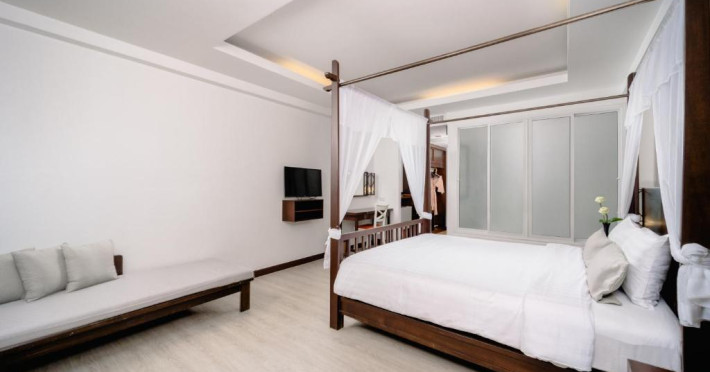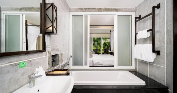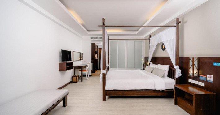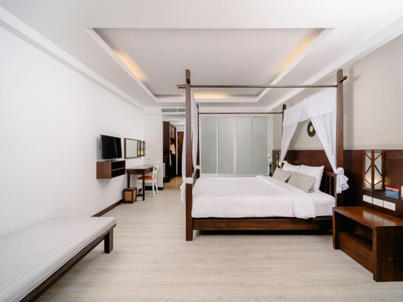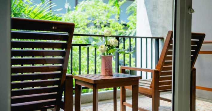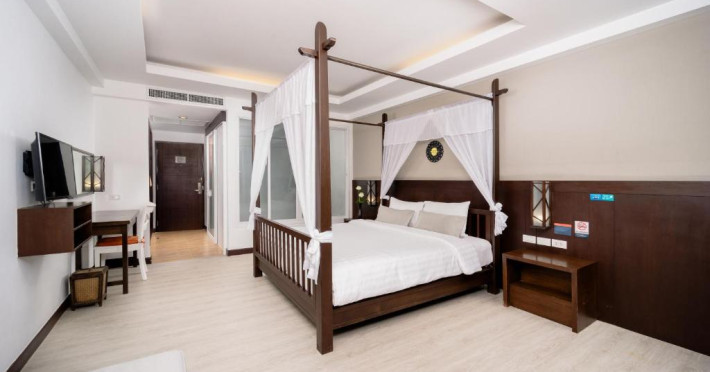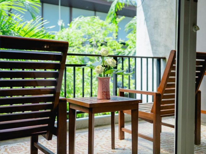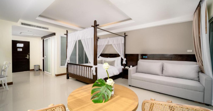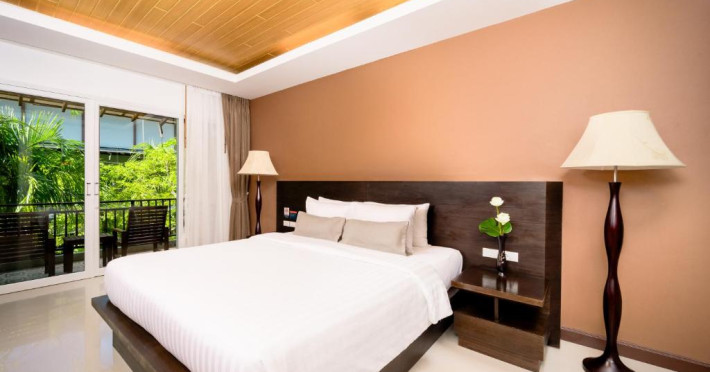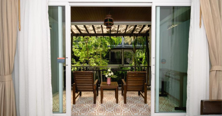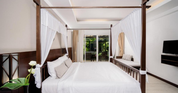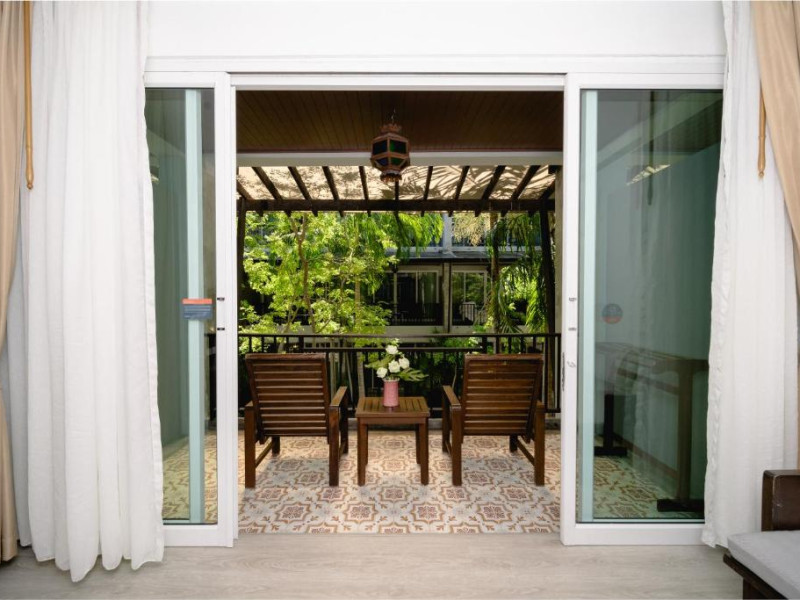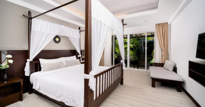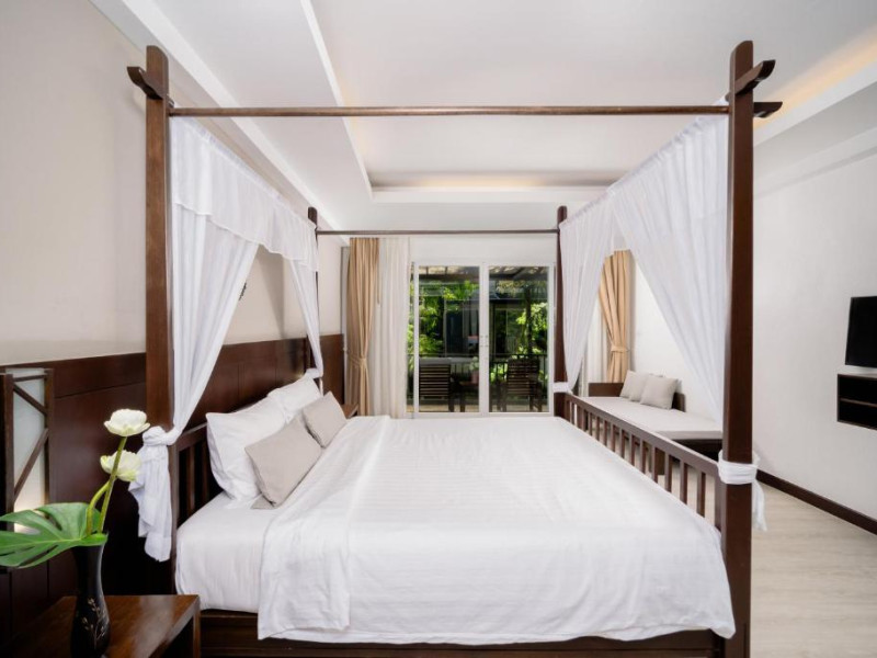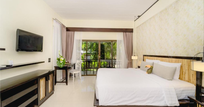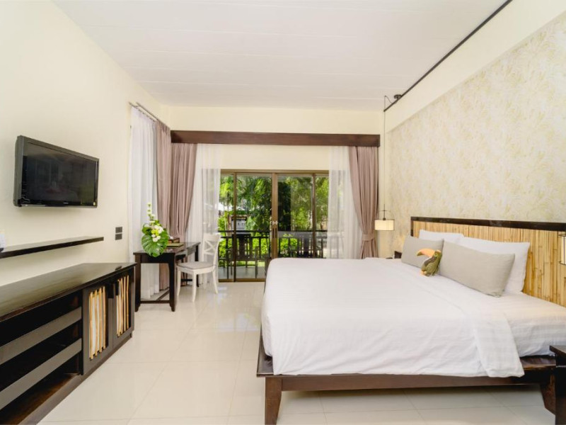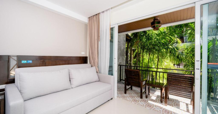 Camerele de la Railay Princess Resort & Spa au mobilier in stil thailandez, TV prin satelit, zonă de relaxare și balcon privat cu vedere la grădină și piscină.