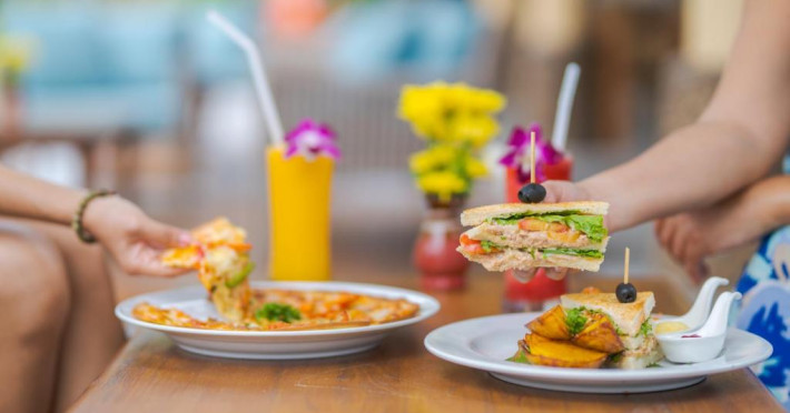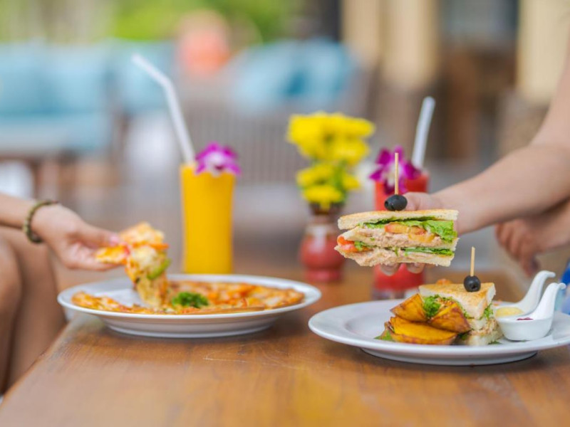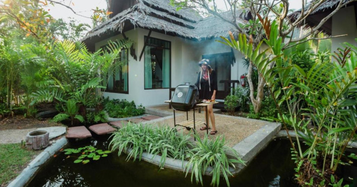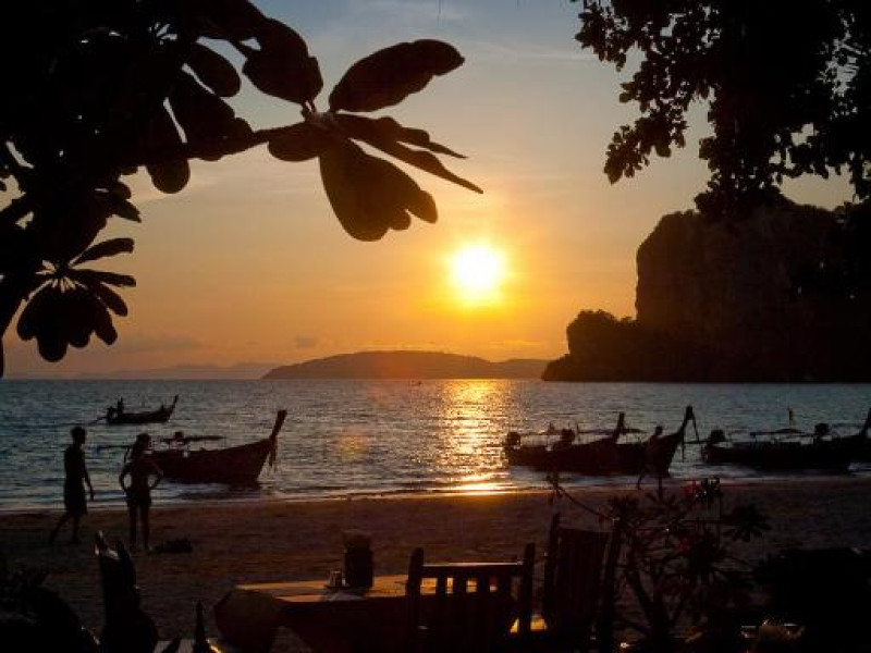 Restaurantul de pe plajă al complexului Railay Village servește fructe de mare proaspete la grătar alături de mancăruri tailandeze și internaționale, avand ca fundal apusul de soare auriu și sunetul plajei.