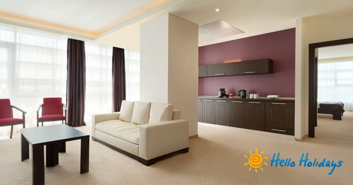 Suita Junior, cu o suprafata de 50 mp, este formata dintr-o camera dubla cu pat matrimonial, canapea extensibila, chicineta, baie proprie cu dus, TV, internet, AC. Capacitate maxima: 2 adulti + 2 copii intre 0 - 15.99 ani sau 3 adulti.