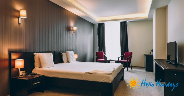 Camerele duble, cu o suprafata de 38 mp si sunt dotate cu pat matrimonial, seif, telefon,TV, minibar, uscator de par, fier si masa de calcat, internet, panou de control al instalatiei de climatizare, buton de panica, halat de baie. Capacitate maxima: 2 adulti + 2 copii intre 0 -15.99 ani.