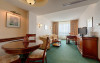 Ramada by Wyndham Bucharest Parc Hotel is located in the northern business district of Bucharest, 500 metres from the Romexpo Exhibition Centre. It offers free WiFi internet and complimentary breakfast. The access to the on-site SPA is free for the guests accommodated in Business Class rooms and Suites, while the guests accommodated in Standard rooms benefit from a discounted fee. The Vitality Wellness Club is equipped with a heated indoor pool, a dry and wet sauna, aerobics room, spinning center and an extensive fitness area. A beauty center and a gift shop can also be found at the Ramada Parc Hotel. The cozy rooms, designed to make guests feel at home, are fully equipped with high-tech facilities. A self-controlled air conditioning system and LCD TV are some of the facilities of the rooms. Romanian and international dishes can be served in the La Parc Restaurant, in a traditional ambience with modern elements and live entertainment, while the Red Pepper Restaurant provides a varied international menu. Guests can enjoy an afternoon or evening in the garden of La Parc Restaurant, while the modern Anais Bar is the perfect place for a drink or a meeting. The hotels coffee shop serves light meals during the day. The hotel features an events center with 16 conference rooms with capacities from 10 to 400 people. The Bucharest Business Park, as well as other major office buildings, are in close proximity and the Baneasa Shopping City can be reached within a 10-minute drive. From the hotel to the city center there are 4 km and the Henri Coanda Airport is reachable within 15 minutes by car. Airport Shuttle Available for a sucharge - for reservations please contact reservations@ramadabucharestparc.ro WYNDHDatorita dinamicitatii domeniului disponibilitatea ofertelor se modifica de la un moment la altul. De aceea ofertele sunt valabile in limita locurilor disponibile. Agentia nu este responsabila pentru eventualele neconcordante care pot aparea intre informatiile privind tarifele si alte detalii din site si informatiile primite in agentie. In aceste cazuri vor avea prioritate, intotdeauna, informatiile primite in agentie.