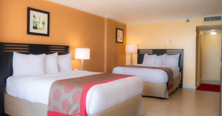Each warmly decorated room at Ramada Plaza by Wyndham Marco Polo Beach Resort features a wall-mounted, 27-inch LCD TV. A fridge and a small table with chairs are provided. Many rooms have a private balcony.
