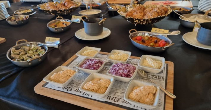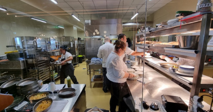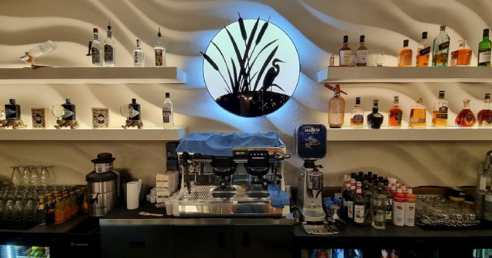 Intre bucatarie si restaurant exista un geam de unde se poate urmari activitatea echipei de bucatari si prepararea comenzii. Meniul respecta specificul Deltei, insa exista si preparate romanesti si internationale pe baza de carne.De asemenea, pentru grupuri exista optiunea de live cooking,