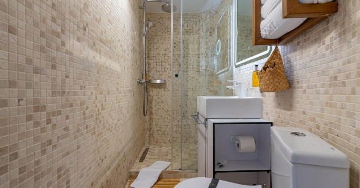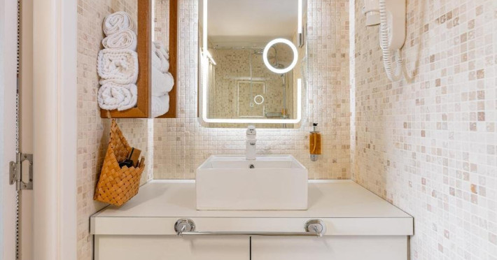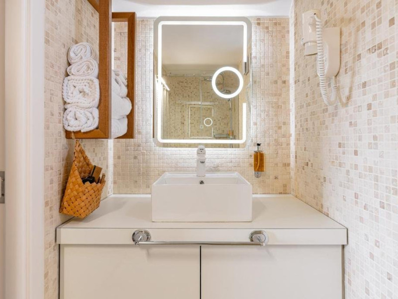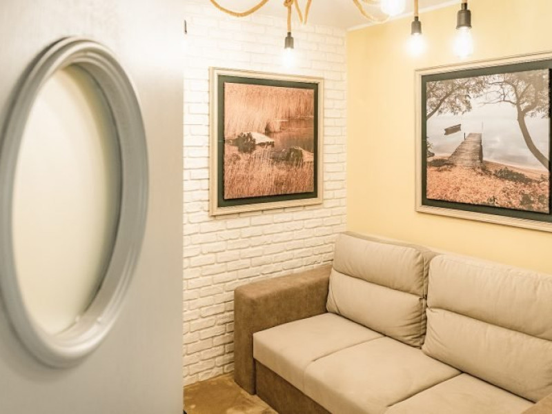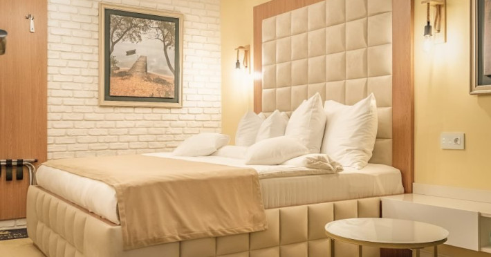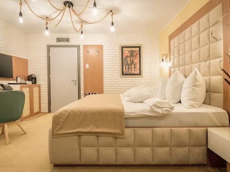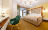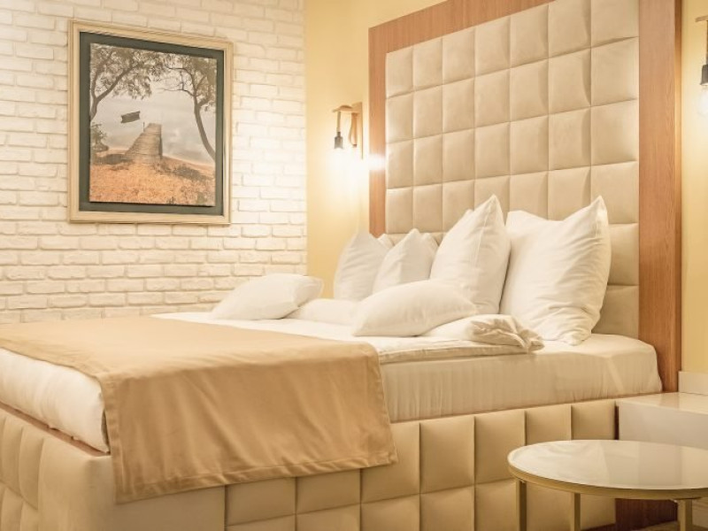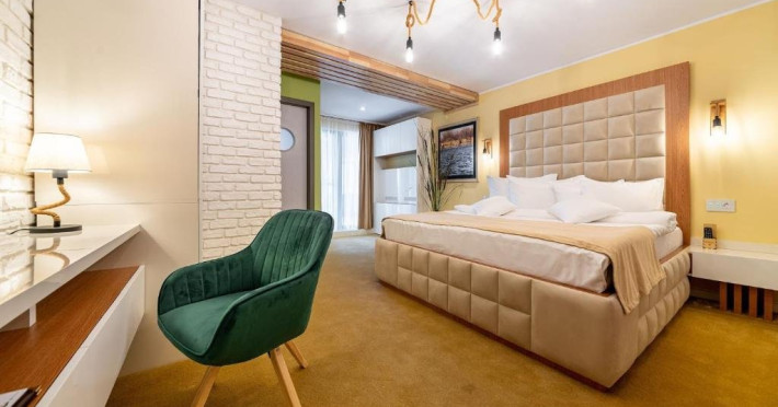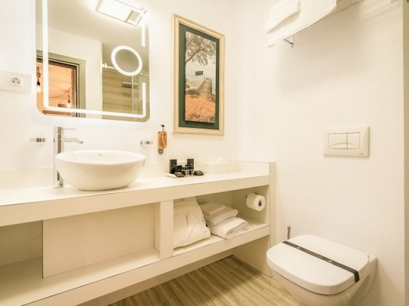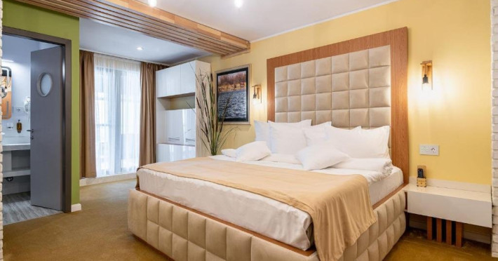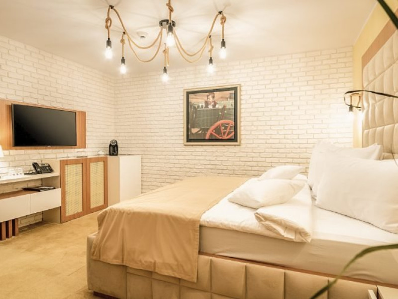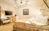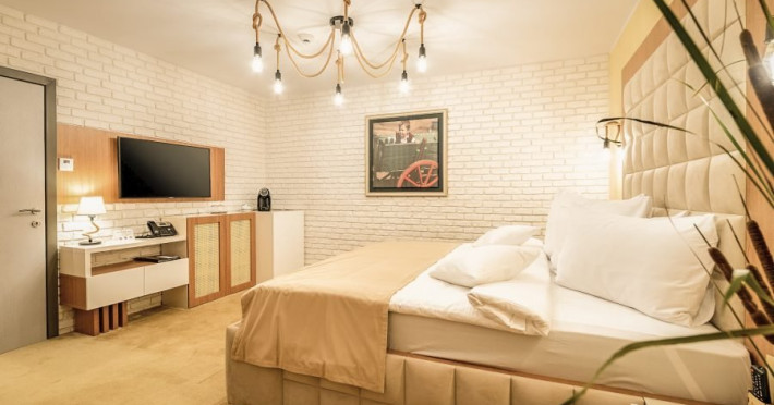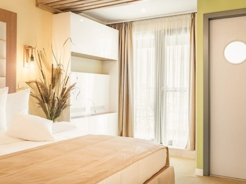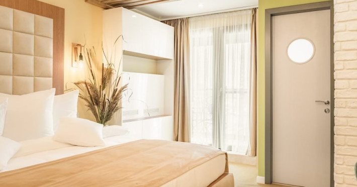 Tholos Junior Suite este compus din doua camere separate, un dormitor cu pat matrimonial si un living cu canapea extensibila, cu o suprafata totala de 36 mp, fara balcon.