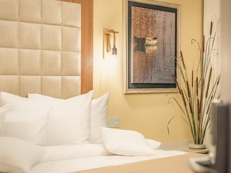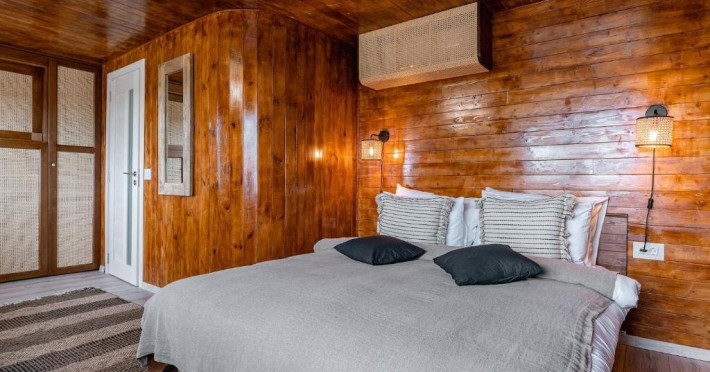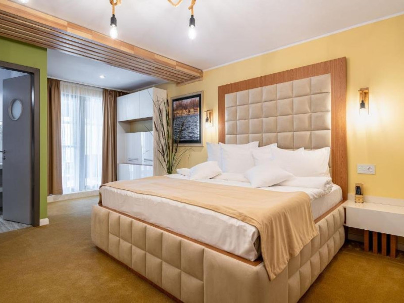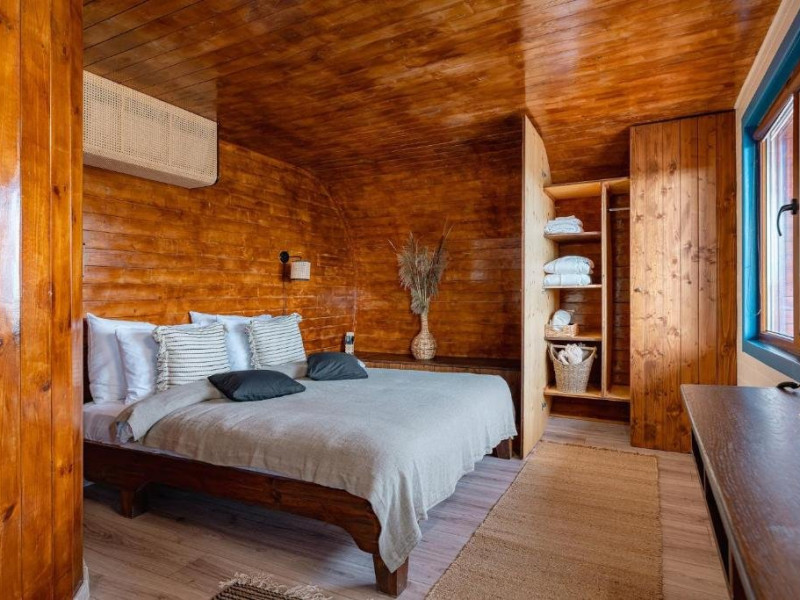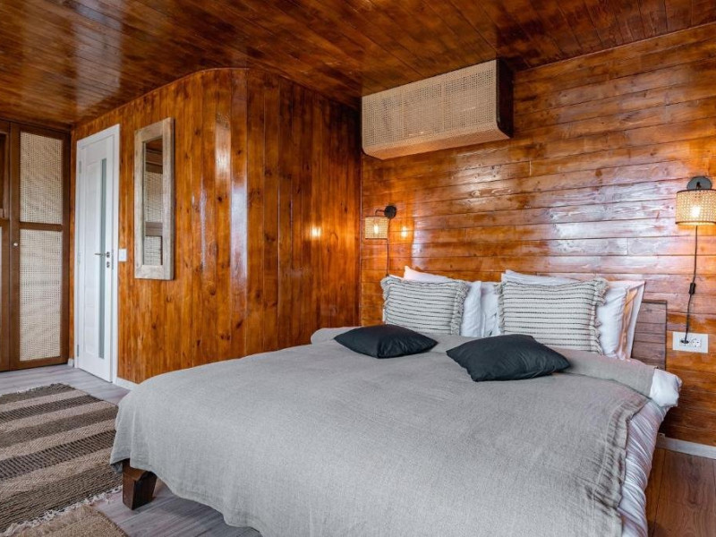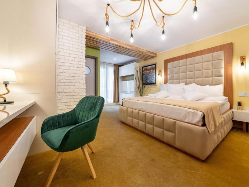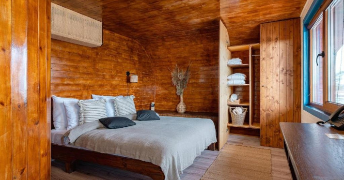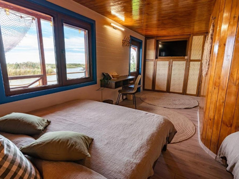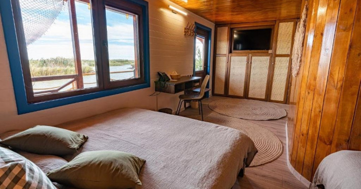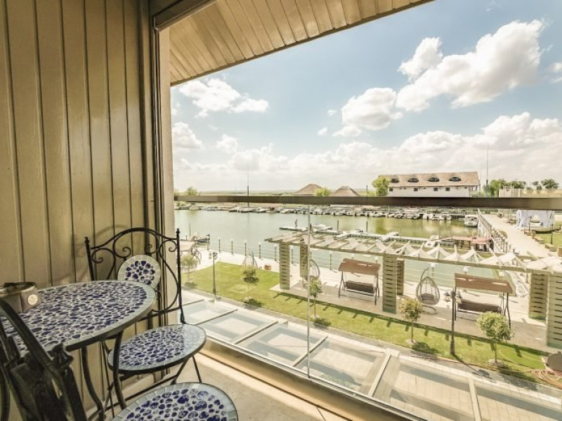 Amyntas Premium dispune de pat matrimonial, are o suprafata de 17 mp si o terasa cu vedere spre lacuri si canale.