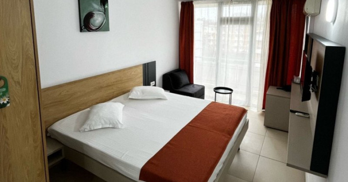 Apartamente cu living si dormitor - aer conditionat (doar in living), mobilier, canapea extensibila, televizor LCD, cablu tv, minibar, baie cu dus, mobilier de balcon, wi-fi, pat cu latimea de 1.80 m. Nu au usa intre camere. Accesul in camere se face pe baza de cartela.