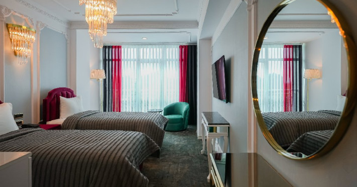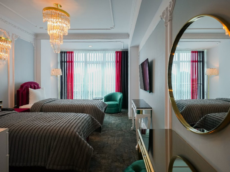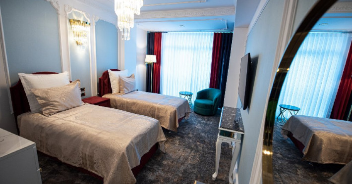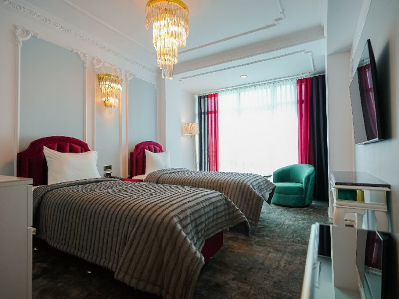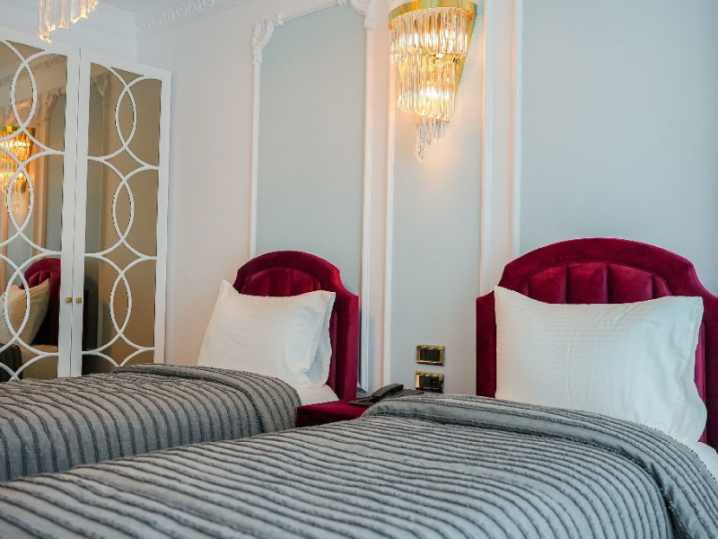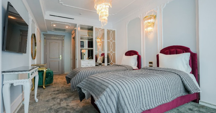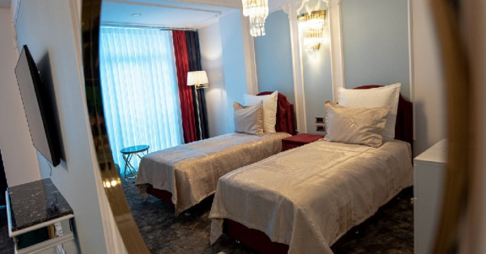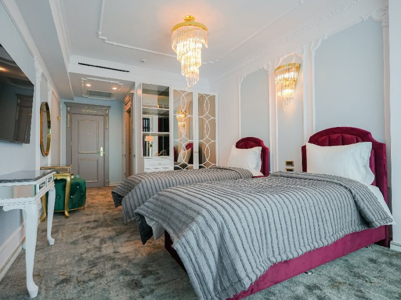 -camera twin: este doatata cu doua paturi separate , spatioasa si confortabila, reprezentand adevarata oaza de liniste de pe malul marii. Camera twin reprezinta un spatiu de odihna si relaxare potrivit atat pentru intalnirile de afaceri, cat si pentru familiile care vin in vacanta alaturi de copii. Astfel,va puteti destinde in zona de dining, bucurandu-va de o bautura sau gustare din minibar, intr-un cadru luxurios, ce defineste rafinamentul.