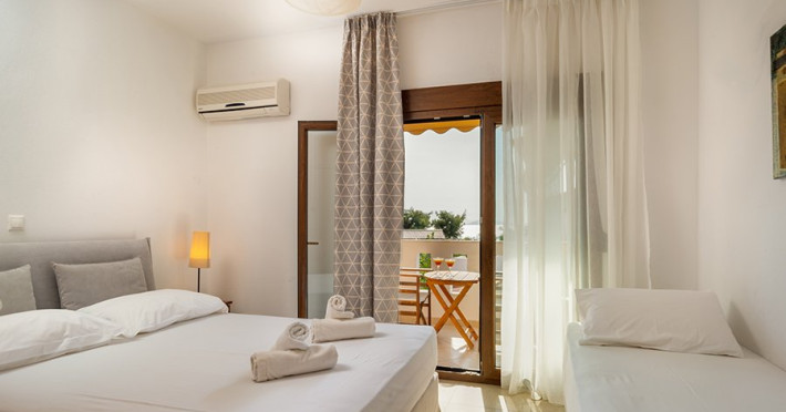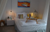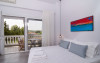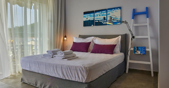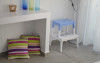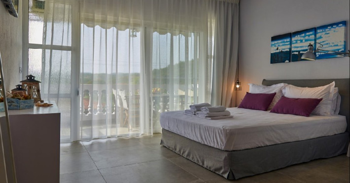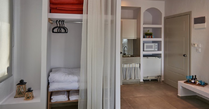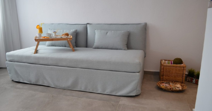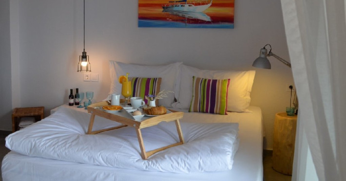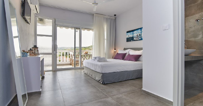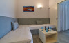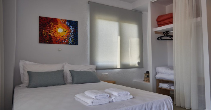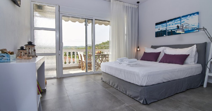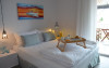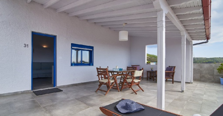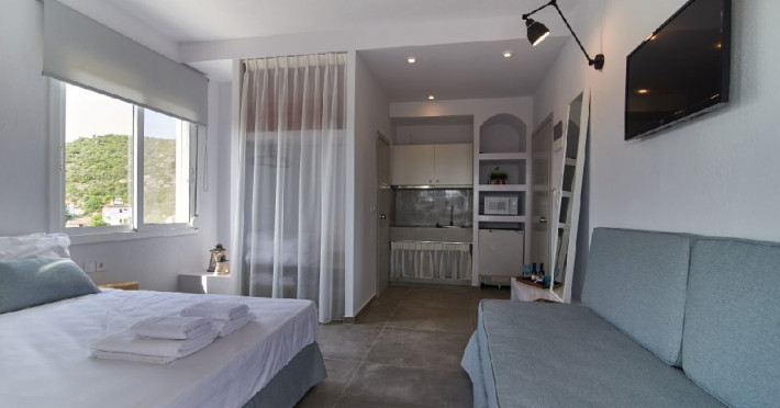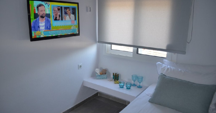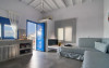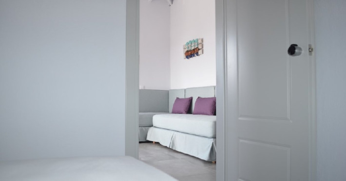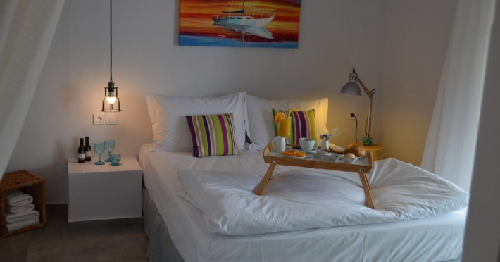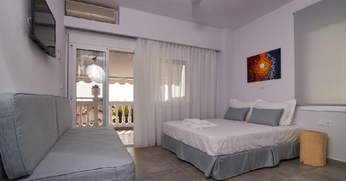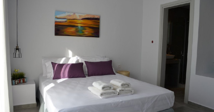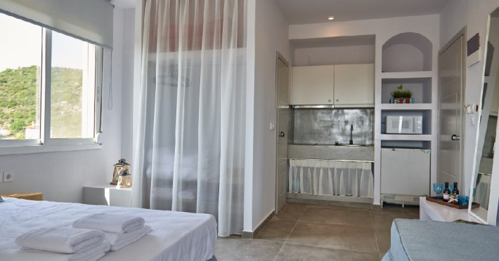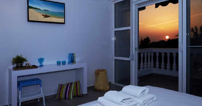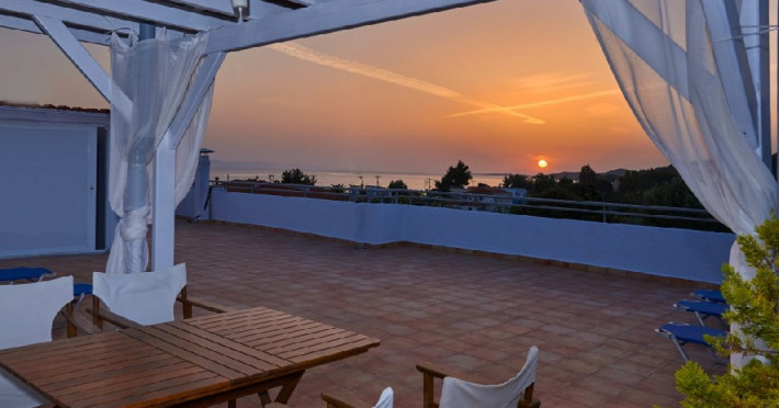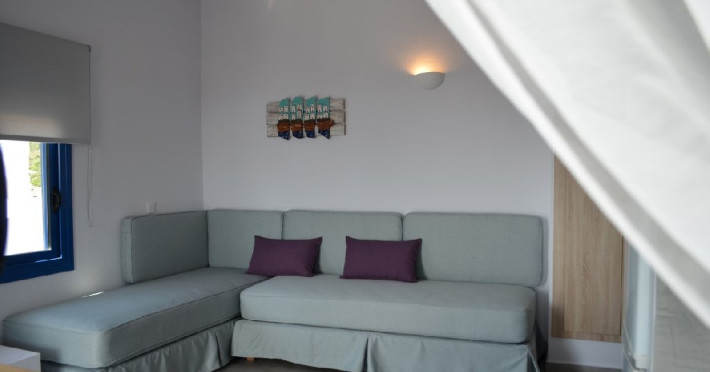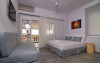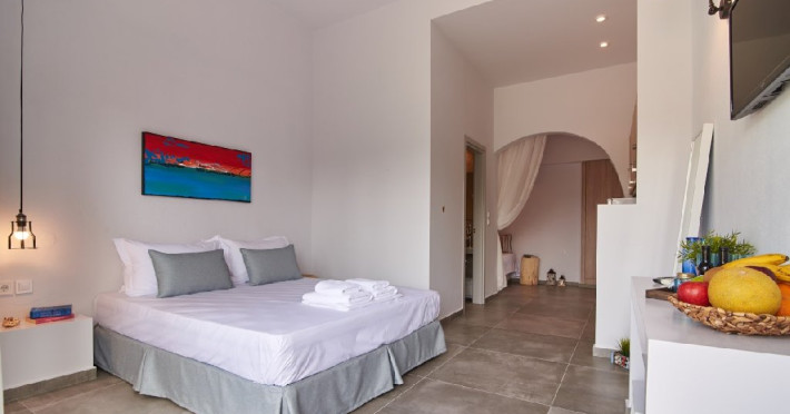 Top floor Junior Suite: 22 m2, etaj 3: dormitor cu pat matrimonial, living micut cu canapea extensibila, terasa (cu gratar) de 50 m2 dotata cu sezlonguri pentru momente unice si vedere la apusul panoramic din marea Egee.