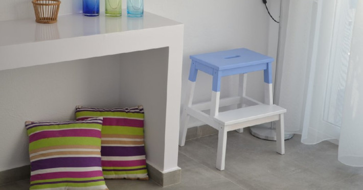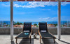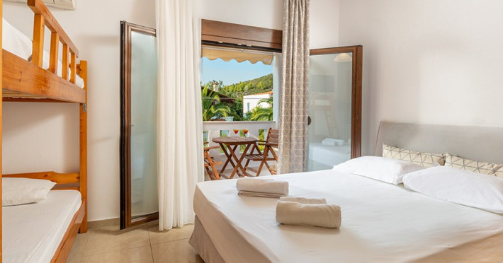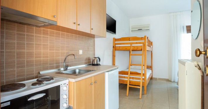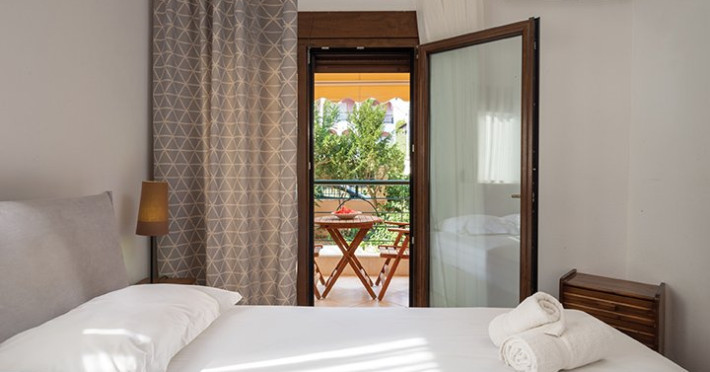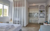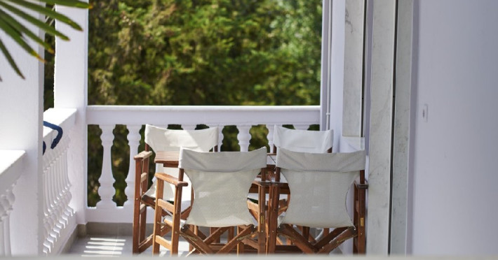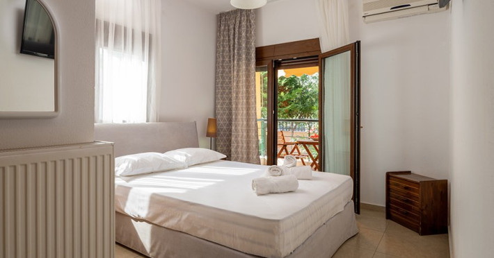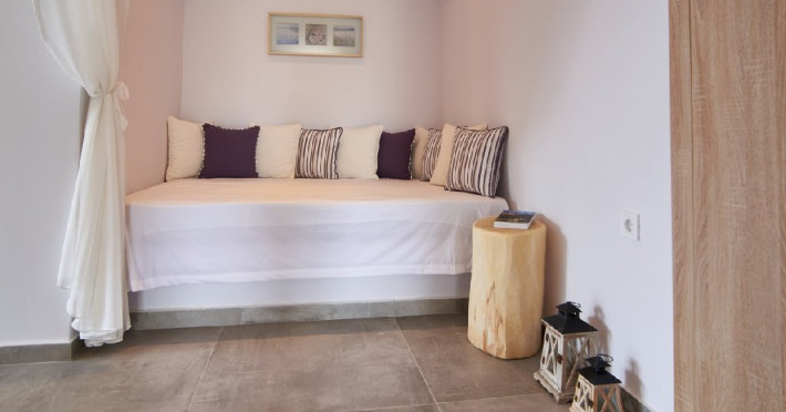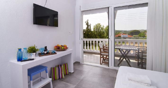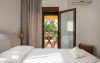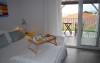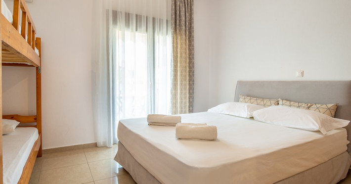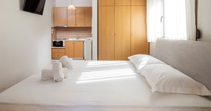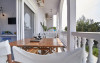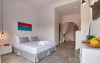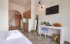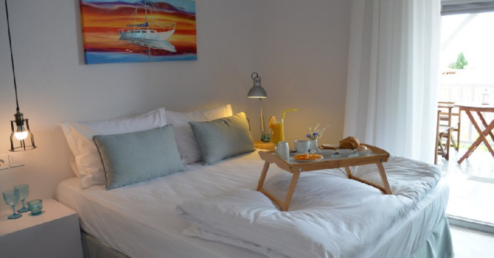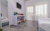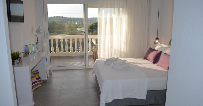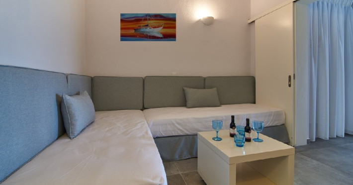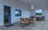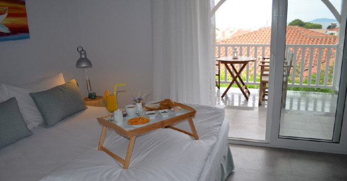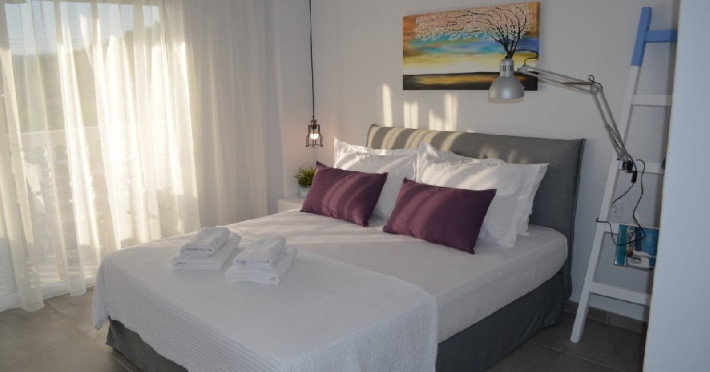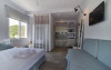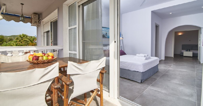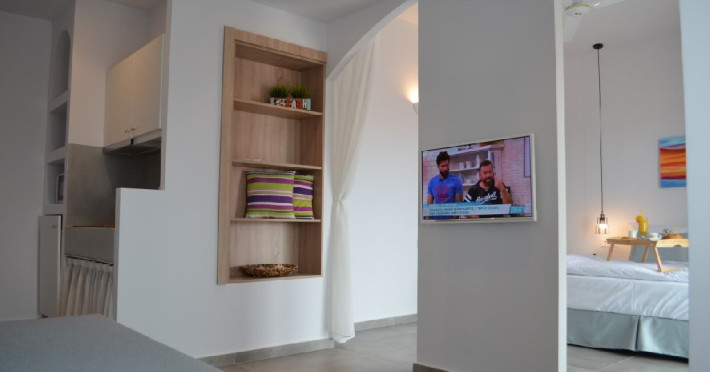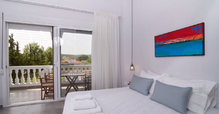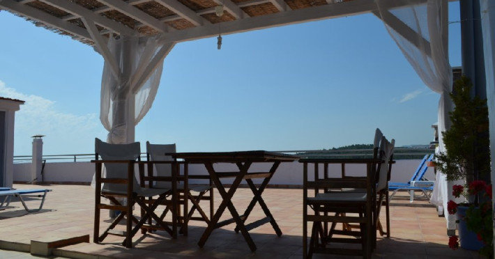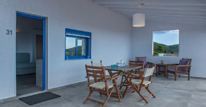 Top floor Junior Suite: 22 m2, etaj 3: dormitor cu pat matrimonial, living micut cu canapea extensibila, terasa (cu gratar) de 50 m2 dotata cu sezlonguri pentru momente unice si vedere la apusul panoramic din marea Egee.