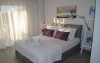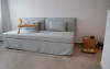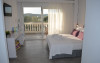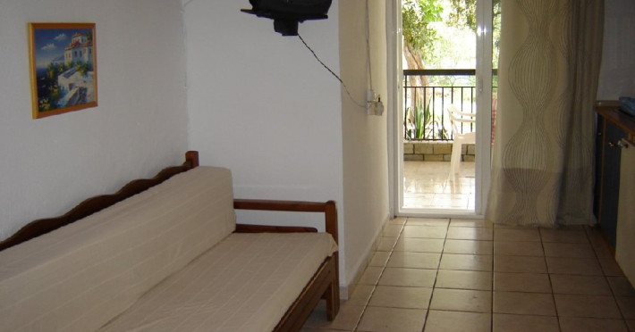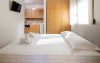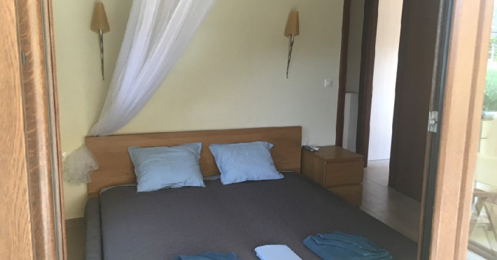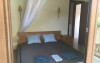 Bungalow 1: 35 m2: dormitor cu pat matrimonial si living cu canapea extensibila.