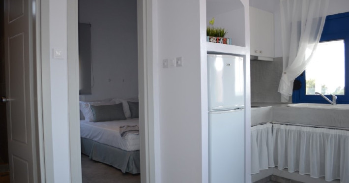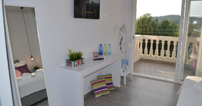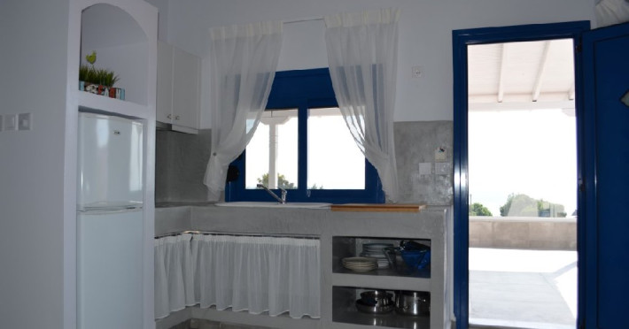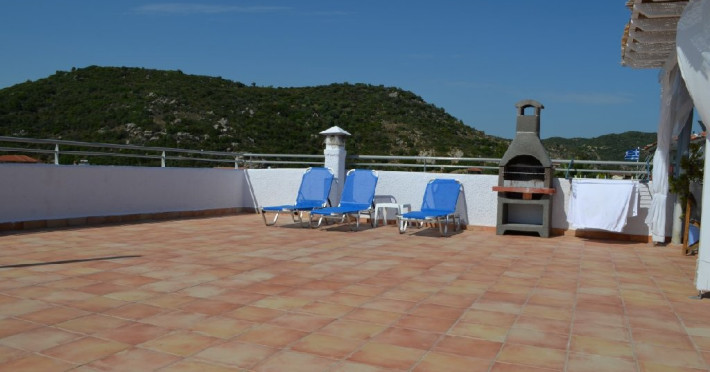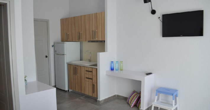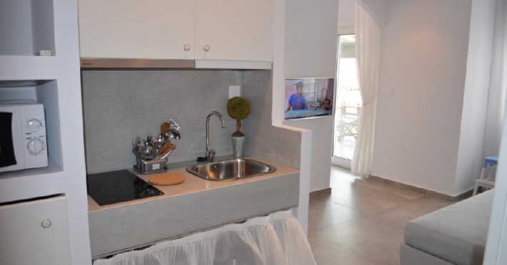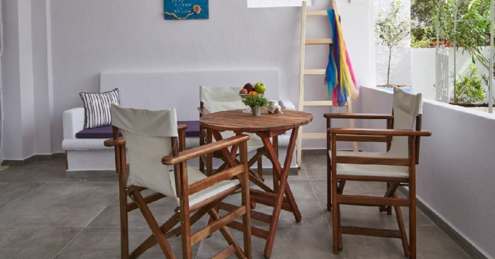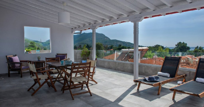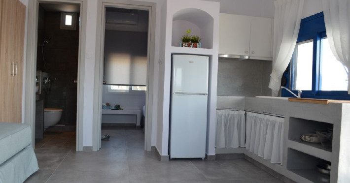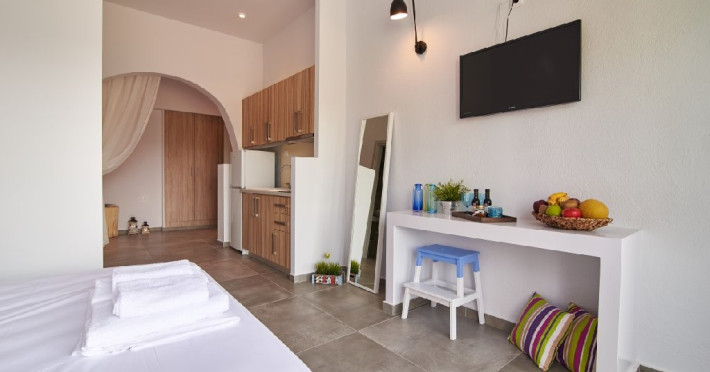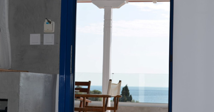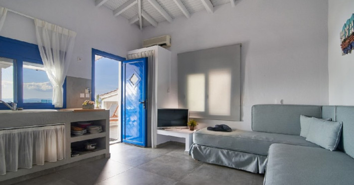 Top Floor Suite: 30 m3, etaj 3: dormitor cu pat matrimonial, living micut cu canapea extensibila, terasa (cu gratar) de 50 m2 dotata cu sezlonguri pentru momente unice si vedere la apusul panoramic din marea Egee.