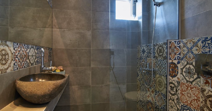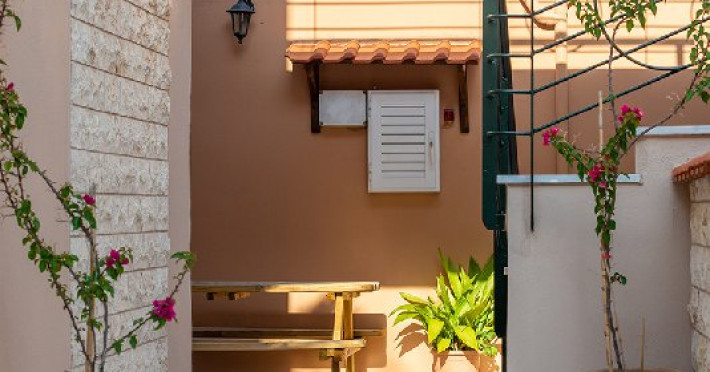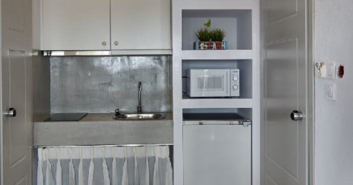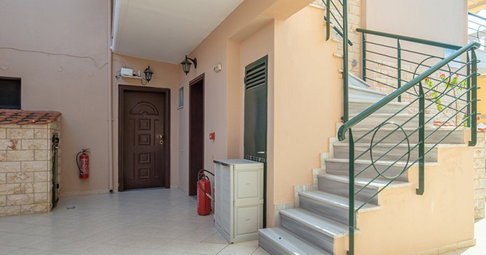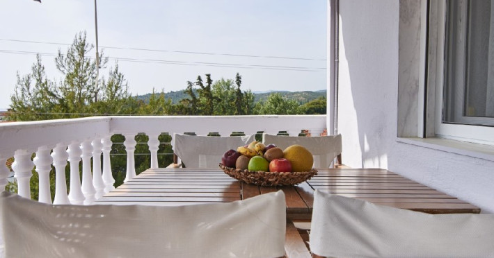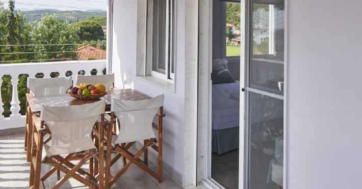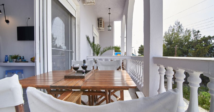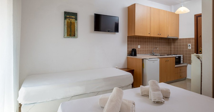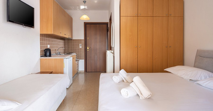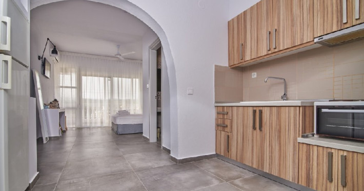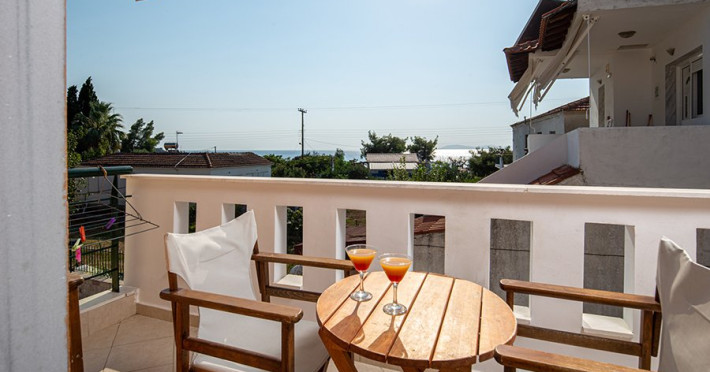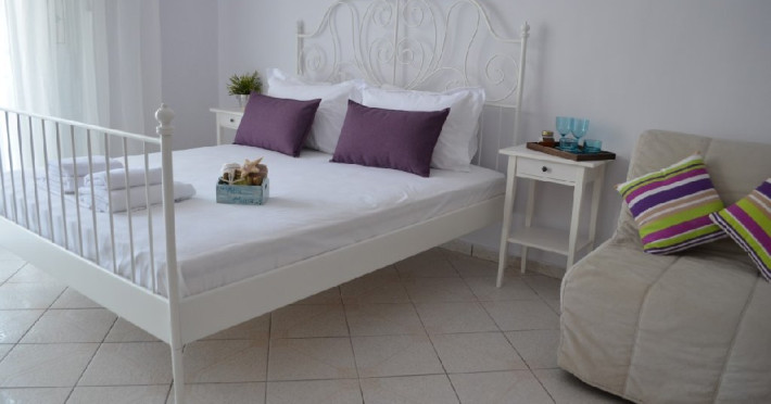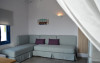 Top Floor Suite: 30 m3, etaj 3: dormitor cu pat matrimonial, living micut cu canapea extensibila, terasa (cu gratar) de 50 m2 dotata cu sezlonguri pentru momente unice si vedere la apusul panoramic din marea Egee.
