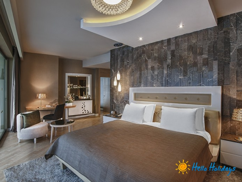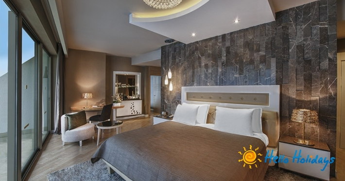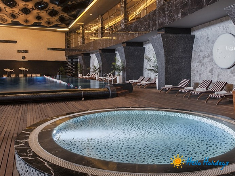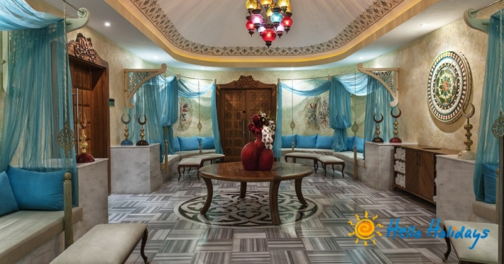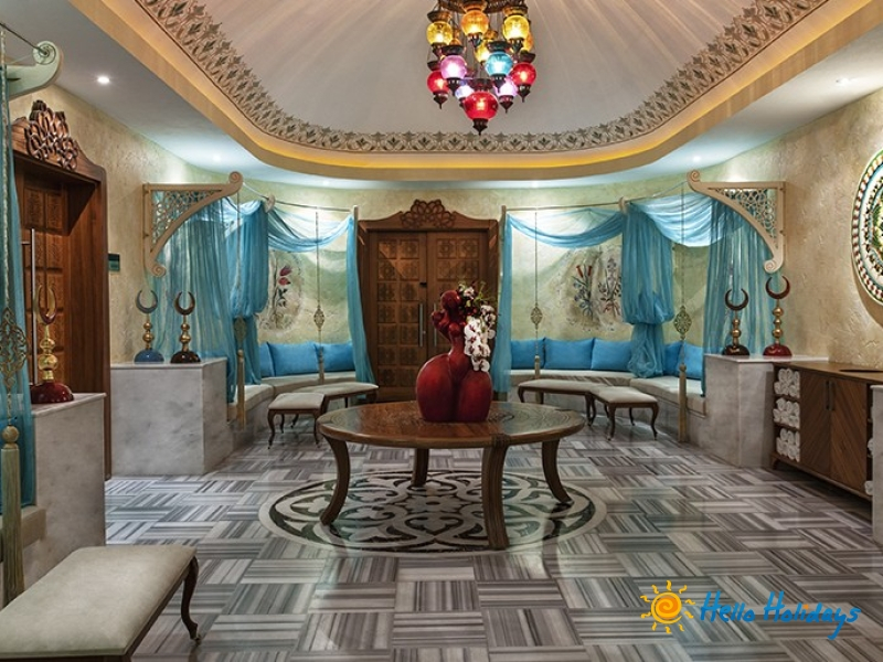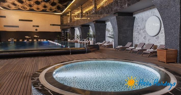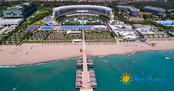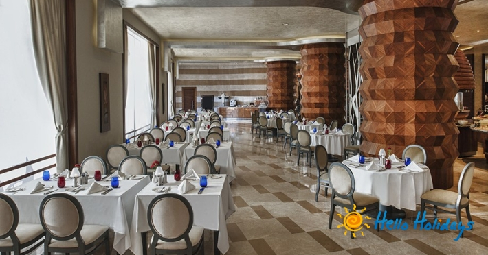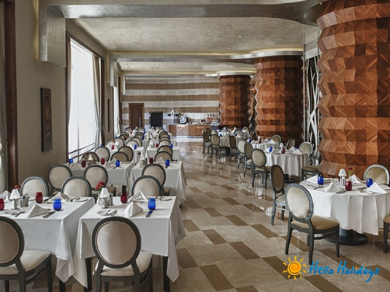 Hotelul beneficiaza de restaurant principal cu diferite meniuri, restaurante a la carte, baruri, 4 piscine exterioare, piscina interioara, tobogane, cinema, SPA, market, sala de fitness, terenuri de tenis, loc de joaca, plaja privata, sezlonguri.