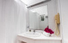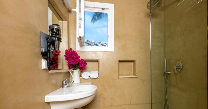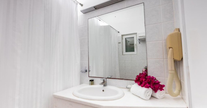 În camere există baie cu cadă sau duș prevăzută cu foehn. Camerele de la Rhenia sunt dotate cu aer condiționat, Tv cu canale prin satelit și seif. Unele camere au balcon cu vedere la mare sau la piscină. Fiecare cameră dispune de minibar. Oaspeții au acces gratuit la serviciul Wi-fi în camere. Curățenia in cameră se face zilnic. Toate camerele spațioase de la Rhenia au canapea în living, ceea ce oferă un plus de confort. Proprietatea oferă camere pentru familie cu o suprafață mai mare și un număr mai mare de paturi față de cele standard. Se pot rezerva de asemenea camere pentru nefumători.
