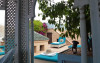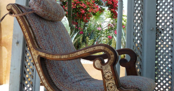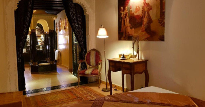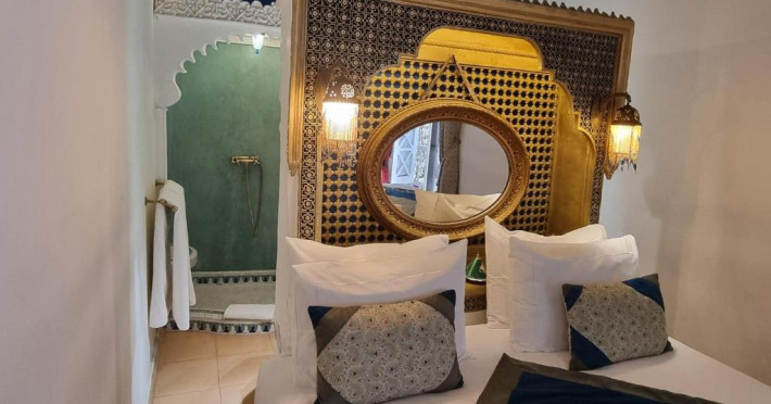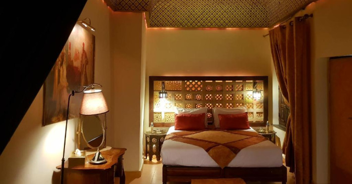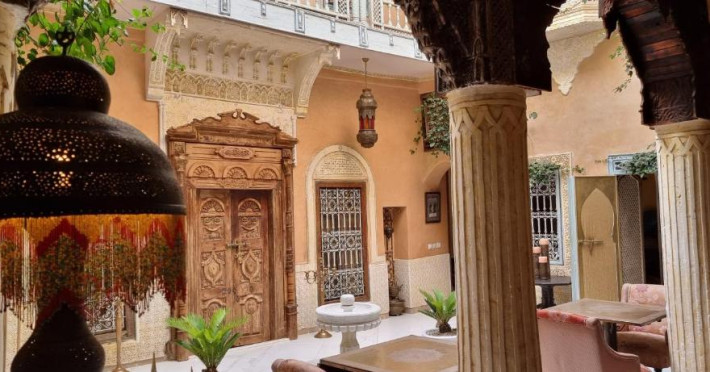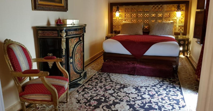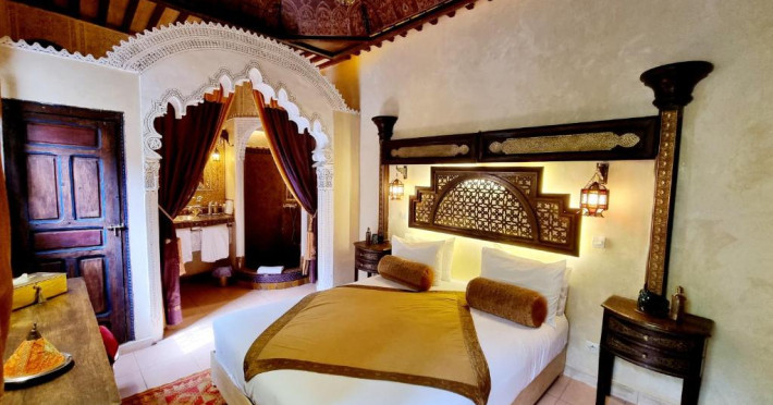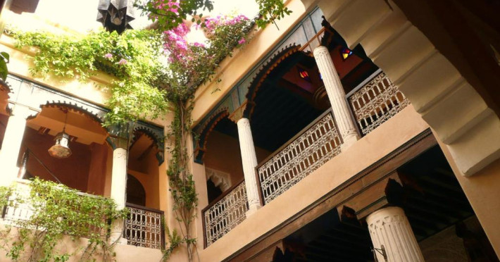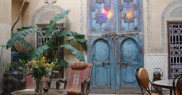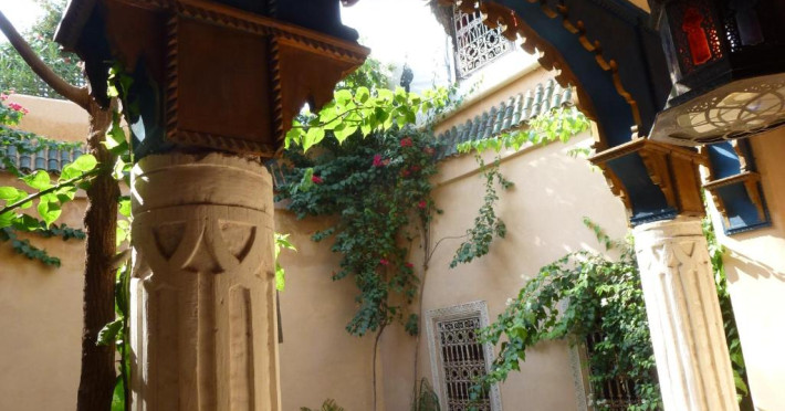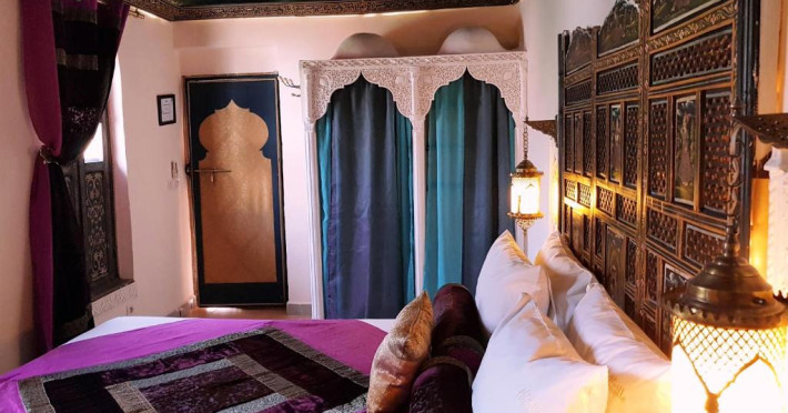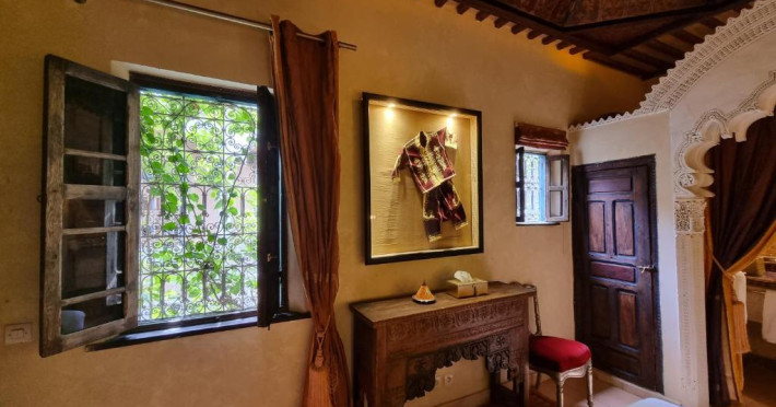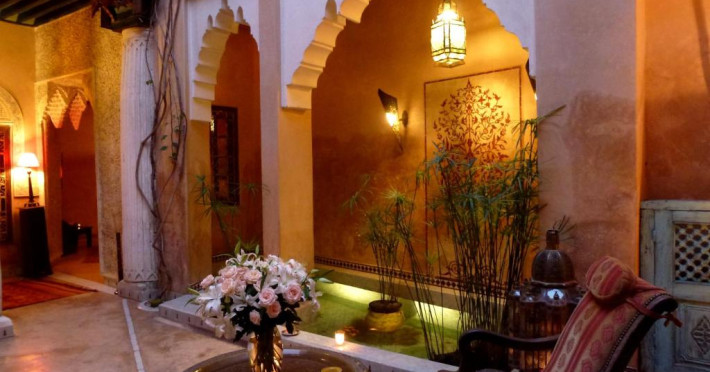 Rooms at the Riad Armelle combine traditional Moroccan details with modern amenities. Guests can relax in the riad’s lounge next to the fireplace or in the courtyard that has a small pool and bougainvillea plants.