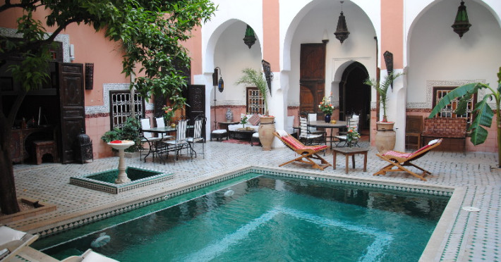 This stunning hotel is situated in the district of Bab Doukkala just a few steps from the castle of Pasha, the famous Jamaa el Fna Square and the Souks. It is the ideal base from which to visit the historic centres of Marrakech, and the district of Gueliz and Hevernage where multiple restaurants and shops are to be found. Golf lovers may find verdant golf course within just 6 km away. This historic establishment features air-conditioned and sumptuously decorated rooms. There is a patio surrounded with galleries and arches, and beautiful terraces with a view on the oldest mosque the Koutoubia and the Atlas Mountains, from where one can admire magnificent sunsets. Travellers may relax on sun beds or have a dip in the swimming pool in gradations of green, offering coolness and tranquillity. This upscale hotel offers guests the chance to discover Moroccan gastronomic delights at the in-house restaurant. The hotel also has a 24-hour reception and private parking.This stunning hotel is situated in the district of Bab Doukkala just a few steps from the castle of Pasha, the famous Jamaa el Fna Square and the Souks. It is the ideal base from which to visit the historic centres of Marrakech, and the district of Gueliz and Hevernage where multiple restaurants and shops are to be found. Golf lovers may find verdant golf course within just 6 km away. This historic establishment features air-conditioned and sumptuously decorated rooms. There is a patio surrounded with galleries and arches, and beautiful terraces with a view on the oldest mosque the Koutoubia and the Atlas Mountains, from where one can admire magnificent sunsets. Travellers may relax on sun beds or have a dip in the swimming pool in gradations of green, offering coolness and tranquillity. This upscale hotel offers guests the chance to discover Moroccan gastronomic delights at the in-house restaurant. The hotel also has a 24-hour reception and private parking.