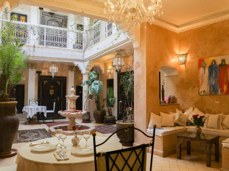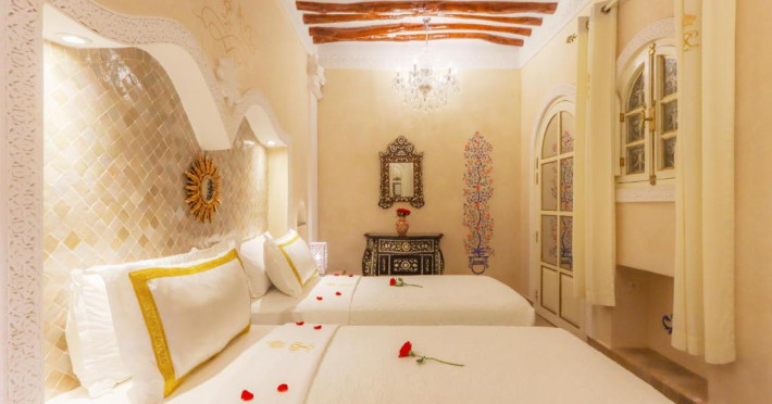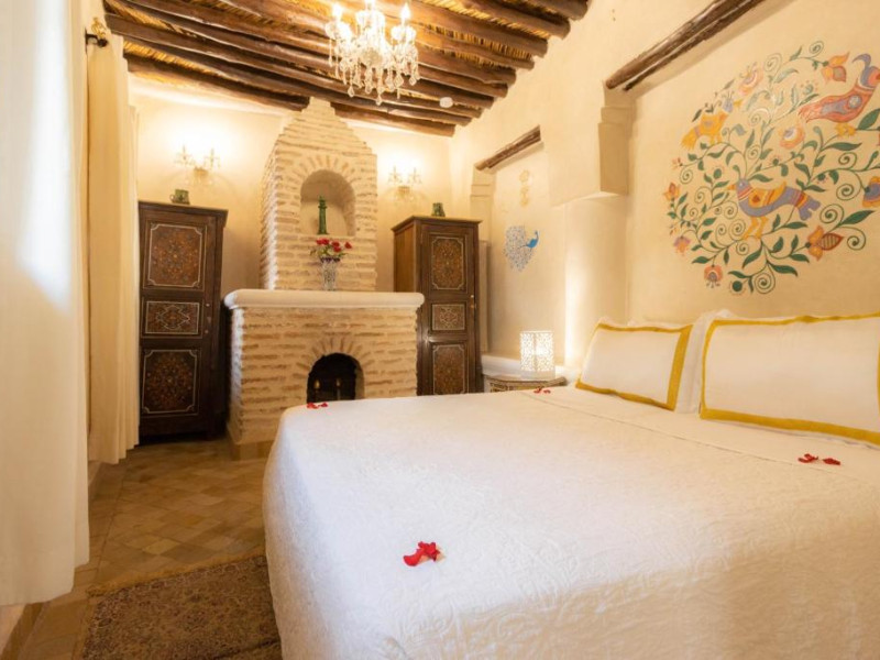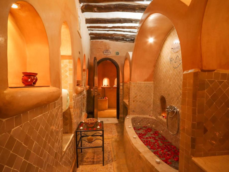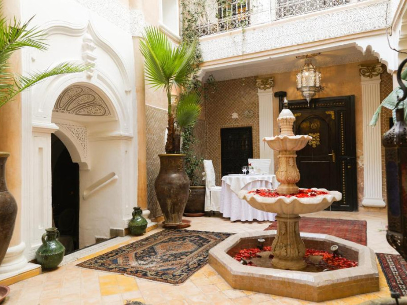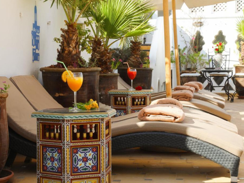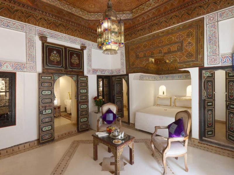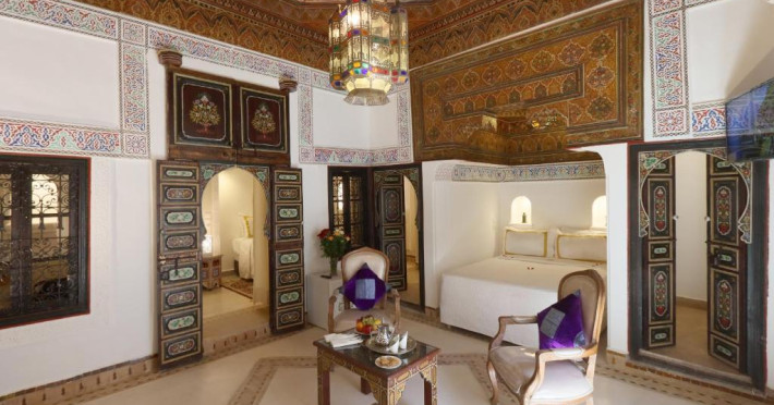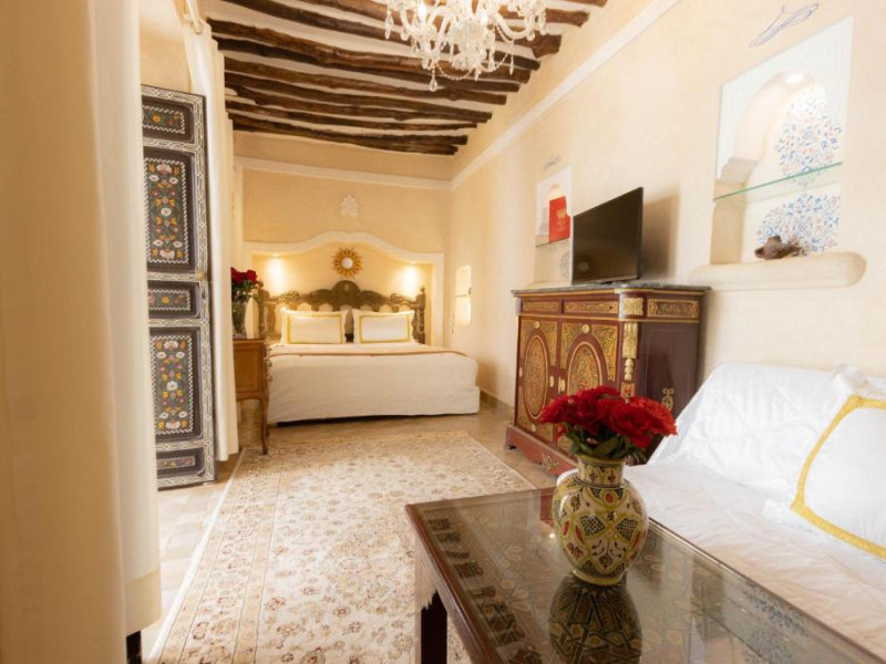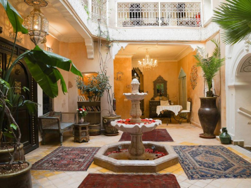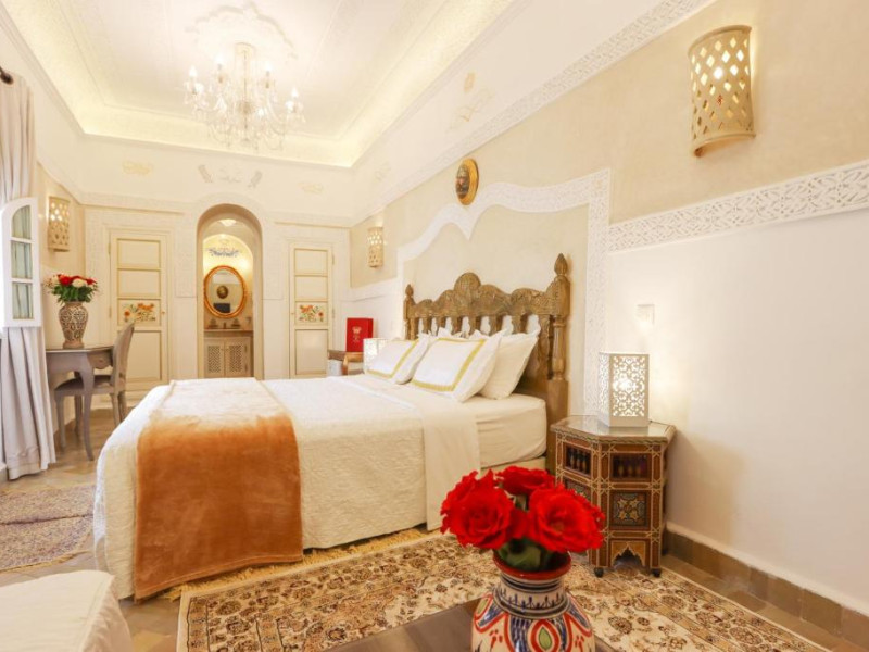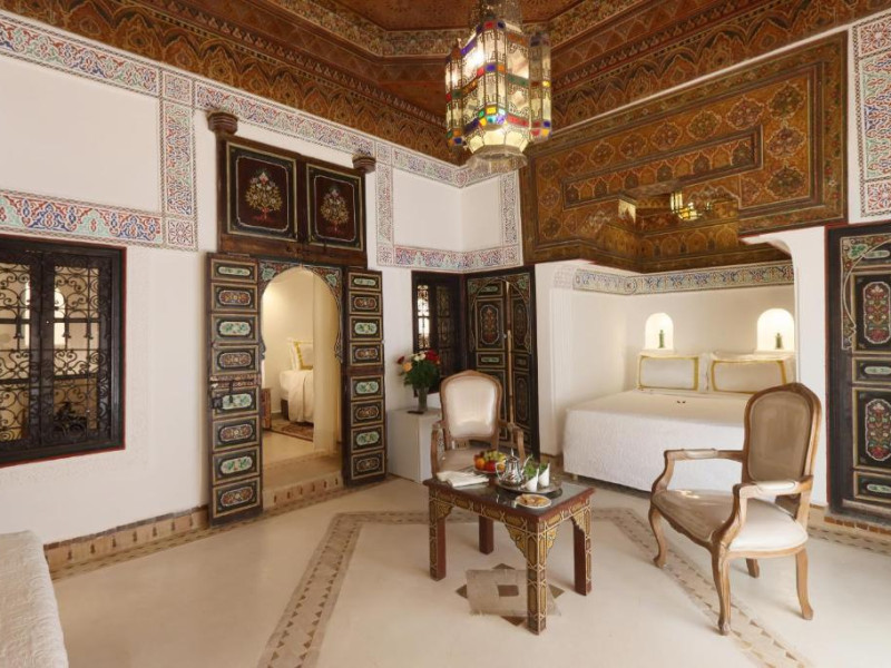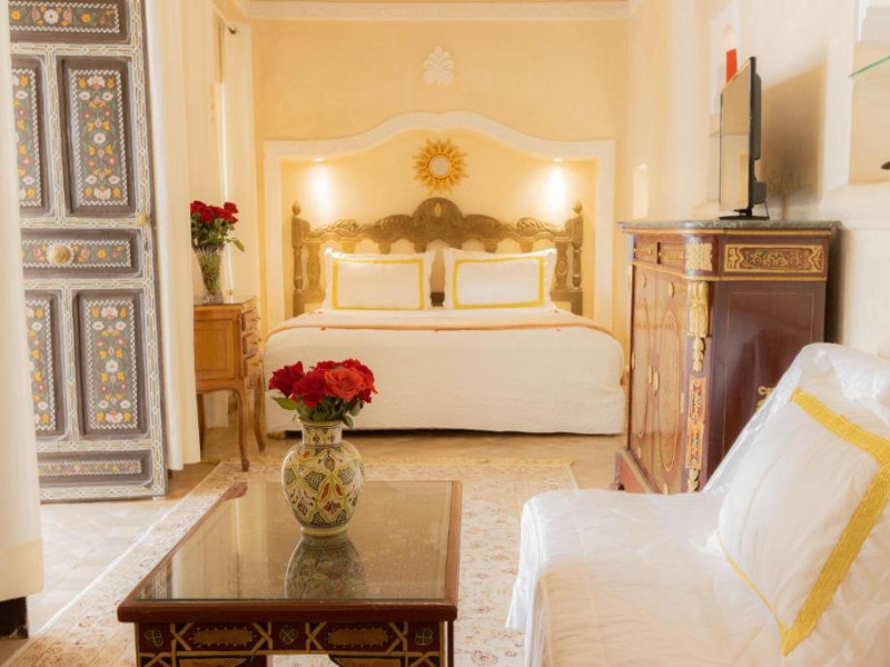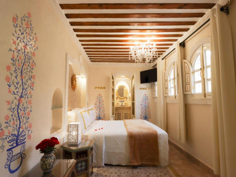 Camerele și suitele, decorate cu mozaicuri tradiționale și mobilier artizanal, păstrează farmecul arhitecturii locale. Facilitățile principale includ un spa cu hammam tradițional, o terasă pe acoperiș cu vedere panoramică asupra orașului vechi și a Munților Atlas, precum și un restaurant care servește specialități marocane autentice.