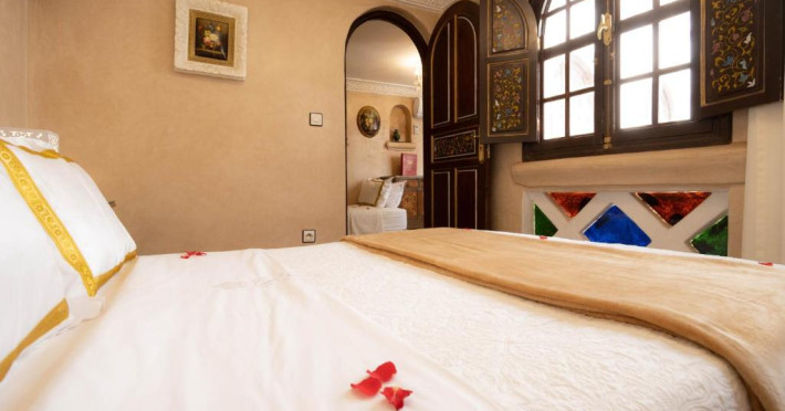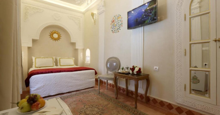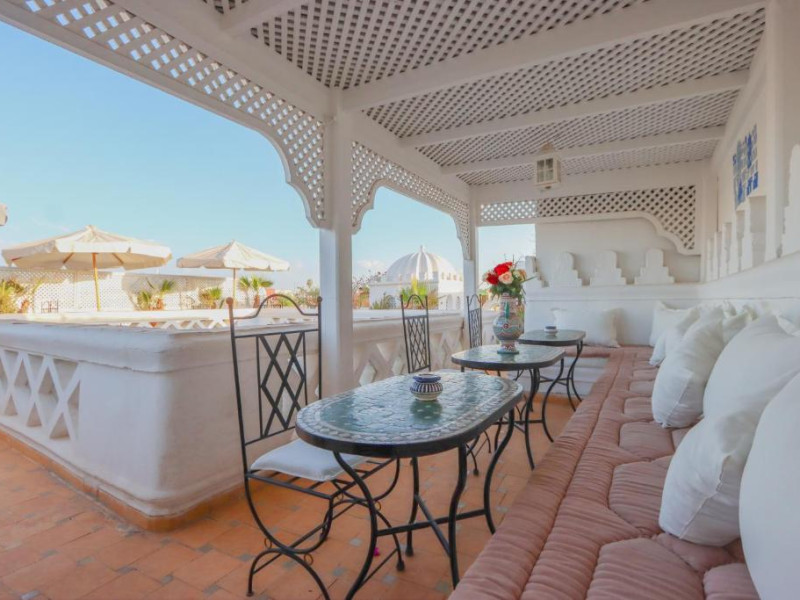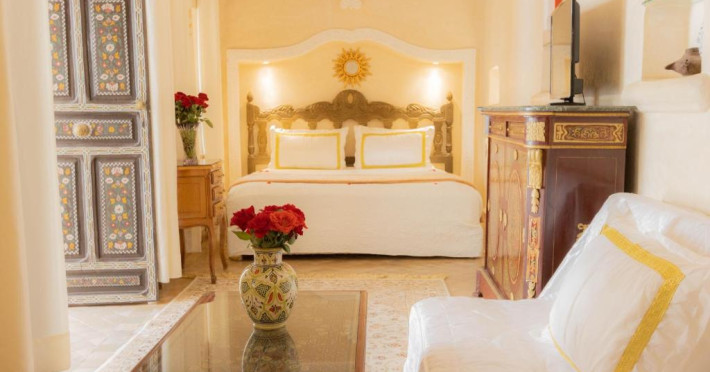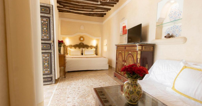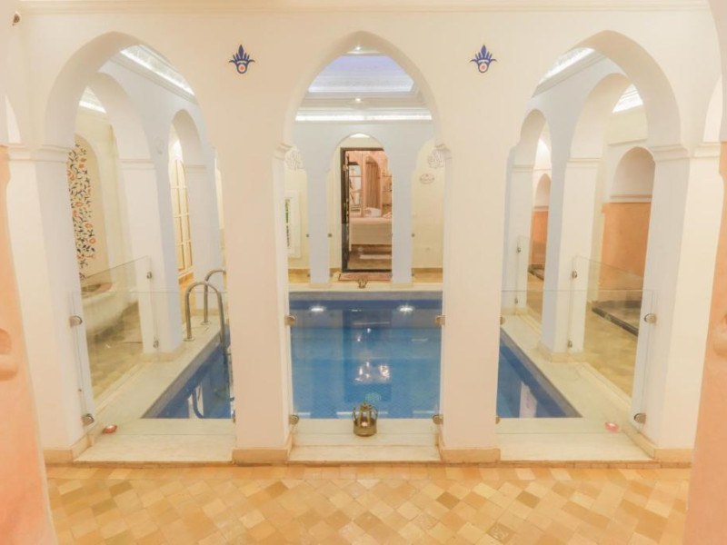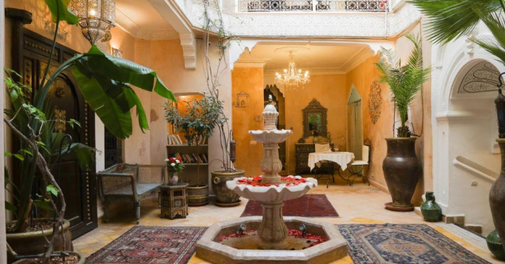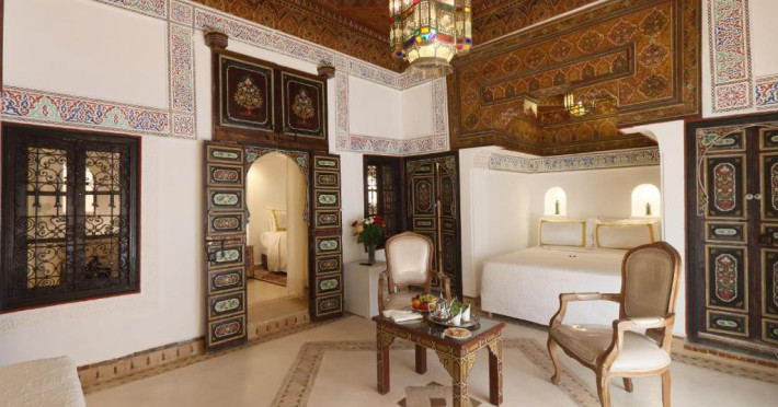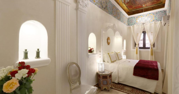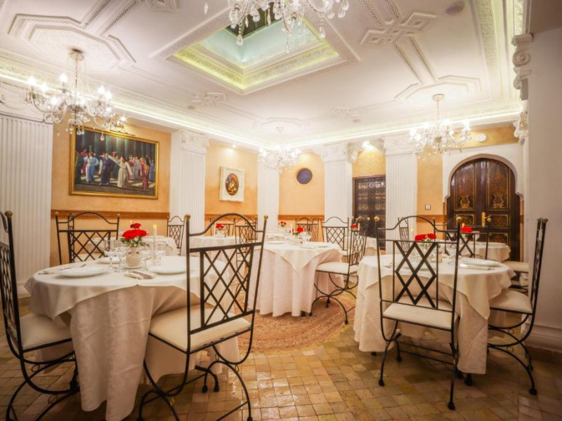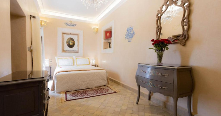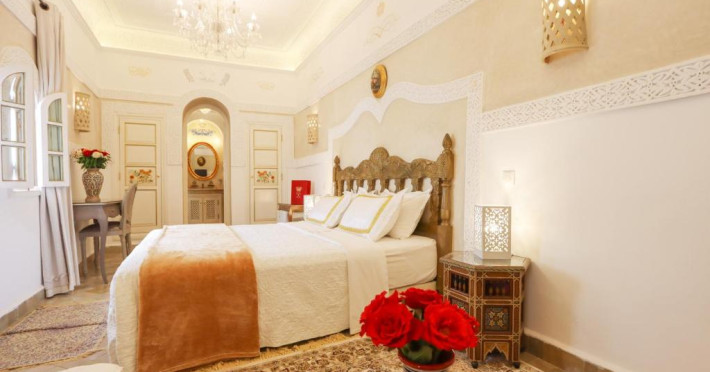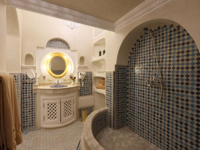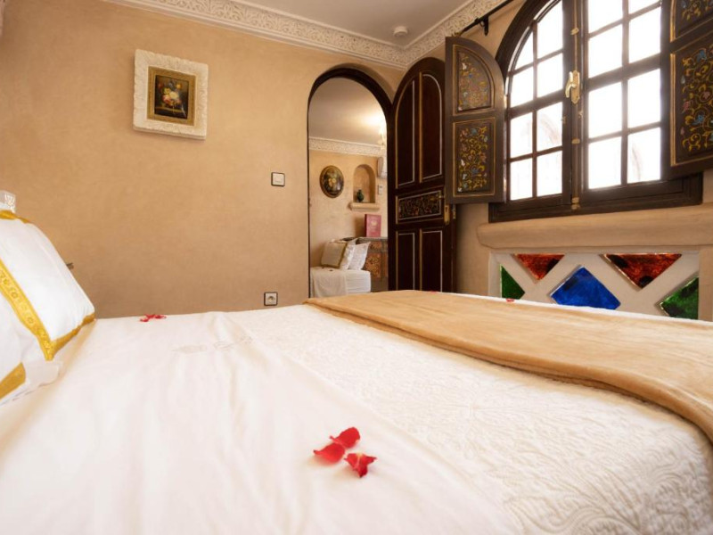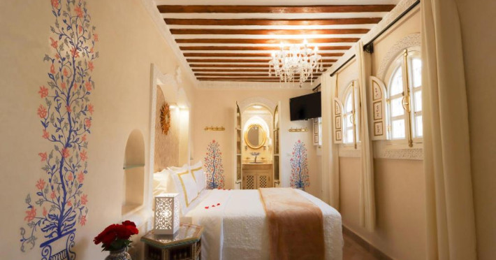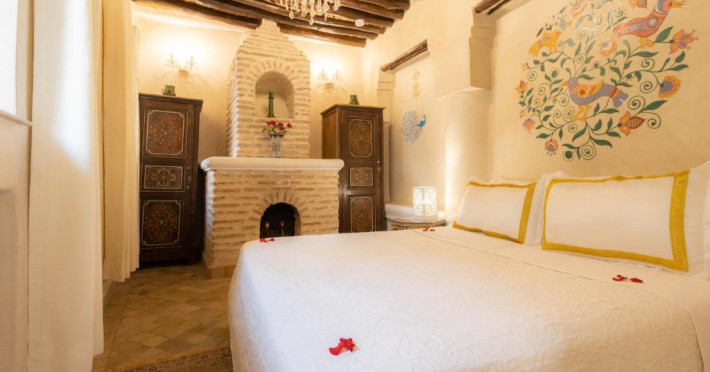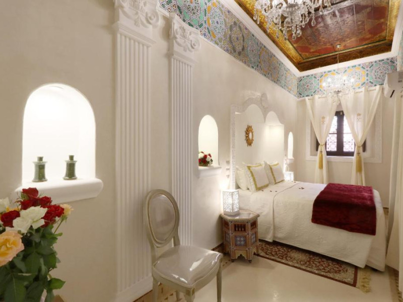 Camerele și suitele, decorate cu mozaicuri tradiționale și mobilier artizanal, păstrează farmecul arhitecturii locale. Facilitățile principale includ un spa cu hammam tradițional, o terasă pe acoperiș cu vedere panoramică asupra orașului vechi și a Munților Atlas, precum și un restaurant care servește specialități marocane autentice.