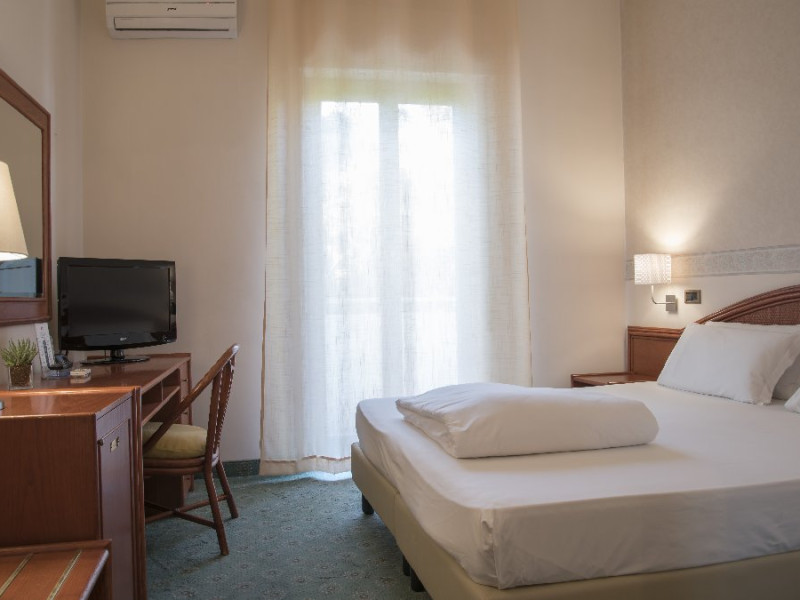Dotari camere: 87 camere dispuse pe 3 etaje in cladirea principala si intr-o cladire adiacenta. Camerele duble dispun de : pat matrimonial, pat suplimentar pentru copil sau a treia persoana adulta in camera, internet WIFI gratuit, baie cu cada sau dus, uscator de par, balcon frantuzesc, A/C individual, halate de baie.