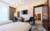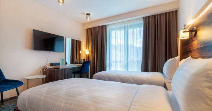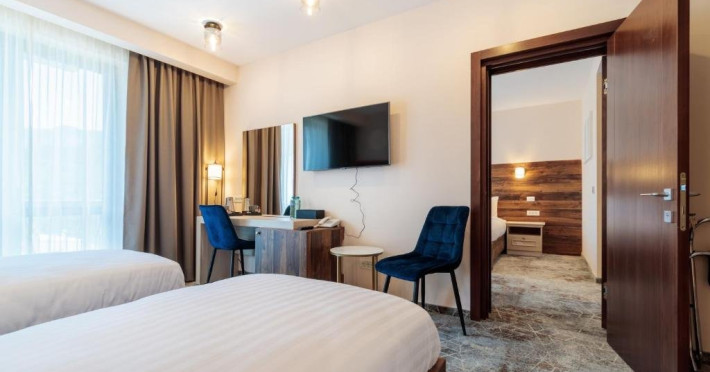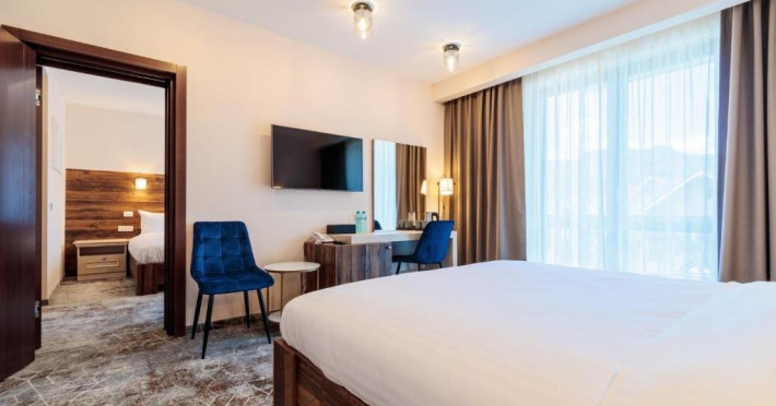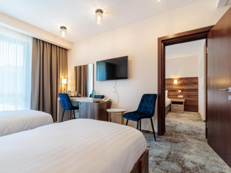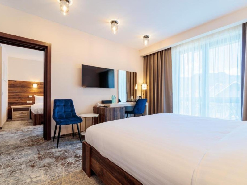 Camerele duble comunicante dispun de o camera cu pat dublu si o camera cu doua paturi separate.