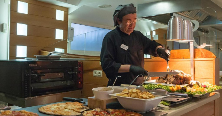 Restaurantul hotelului oferă un mic dejun tip bufet și o selecție de preparate din bucătăria mediteraneană.