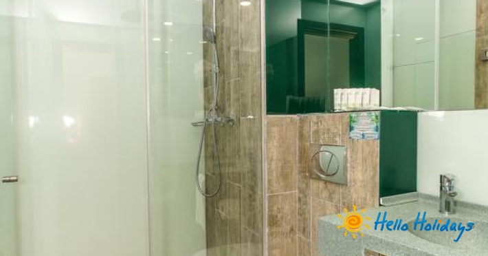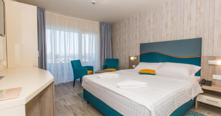 Sistem automat de climatizare, televizor LCD 32 cm, birou, pat de lux, ferestre panoramice izolate fonic, uscator de par, baie cu cabina de dus Walk-In, telefon in camera, sistem de alarma anti - incediu, acces in camera pe baza de cartela, camere pentru nefumatori.
