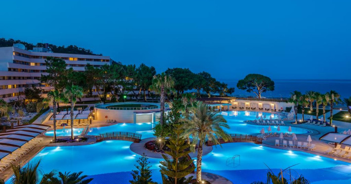 Hotelul dispune de facilitati multiple, precum: 2 restaurante principale, 5 restaurante a la carte, baruri, piscine, loc de joaca, Aqua Park cu 10 tobogane de apa, centru Spa, discoteca, cinema, aerobic, terenuri de tenis, centru fitness, biliard, baschet, magazine. Plaja cu nisip reprezinta oportunitatea perfecta pentru a te bucura de o zi de plaja fara griji, alaturi de familie sau prieteni.