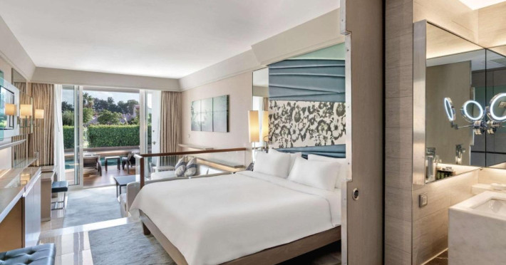 Camerele acestui hotel sunt frumos decorate si utilate cu facilitati precum: baie cu dus, foehn, halat, papuci aer conditionat centralizat,televizor, telefon, minibar, fierbator (set pentru ceai si cafea), seif (gratuit), pardoseala – mocheta si marmura si balcon. Toate camerele au minibar și TV prin satelit. Unele oferă vedere panoramică la Marea Mediterană.
