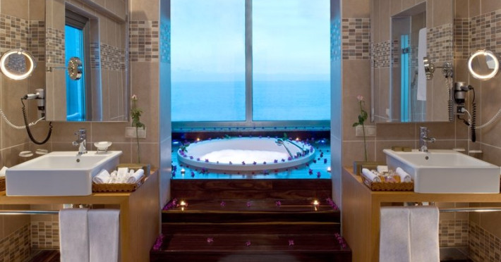 2 grand king suite cu 3 camere (living, 2 dormitoare cu usa, 2 bai, o baie cu jacuzzi cu vedere la mare, 3 TV, max. 5 pers., 161 mp, servicii VIP).