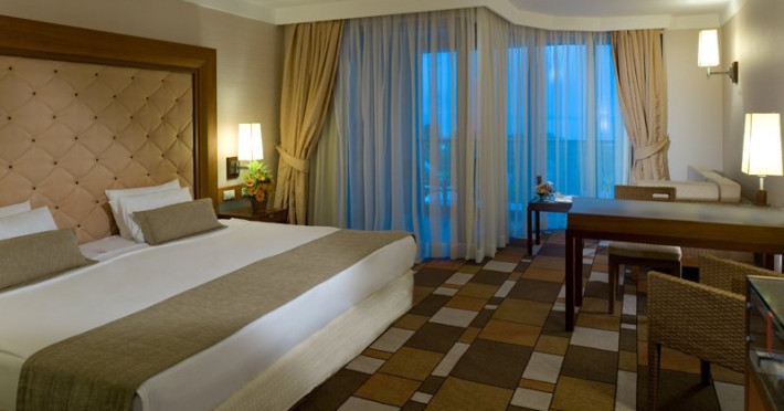 Facilitati camere: Hotelul Rixos Sungate este compus din patru complexe separate: cladirea Main Building Port Queen cu 8 si 5 nivele conectate intre ele, 2 cladiri Terrace Houses cu 5 si 6 nivele, cladirea Family Lake Houses cu 2 nivele (langa piscina) si o zona inchisa VIP Deluxe care include piscine, restaurant, bar, 26 vile cu 2 nivele si o cladire cu 4 nivele. Toate camerele sunt dotate cu baie cu cada, foehn, aer conditionat centralizat, televizor, telefon, minibar (apa, bauturile racoritoare, berea se suplimenteaza zilnic, gratuit), seif (gratuit), pardoseala, mocheta, balcon sau terasa, room service (24 de ore, contra cost) si internet WiFi.