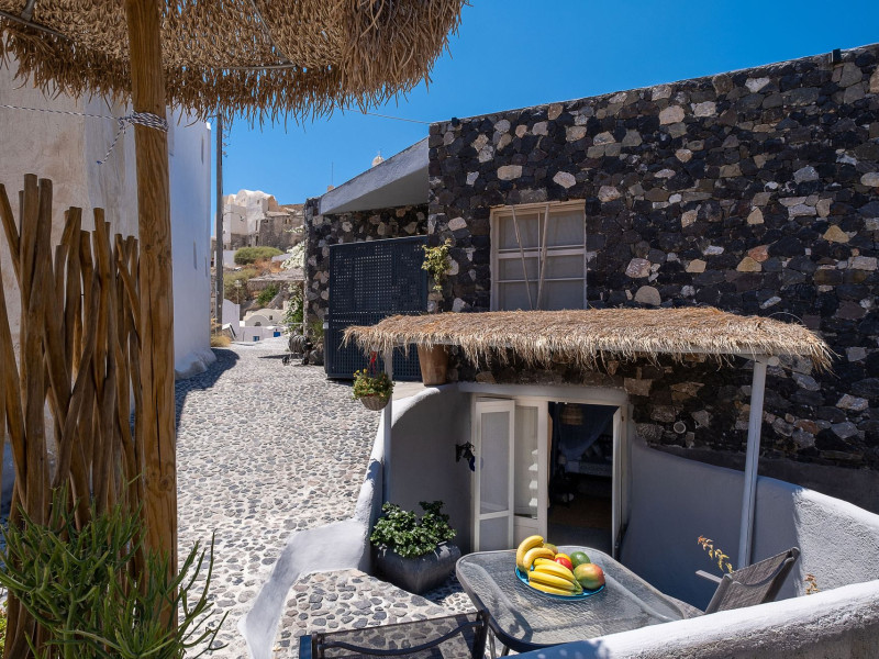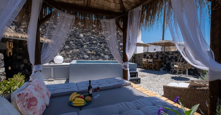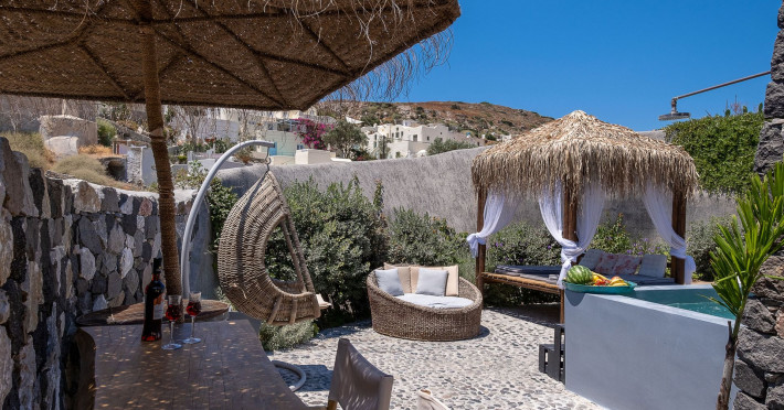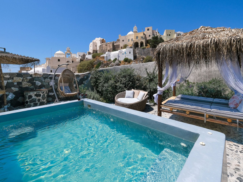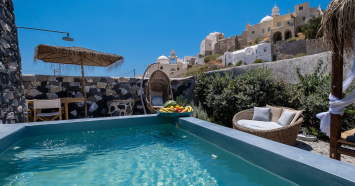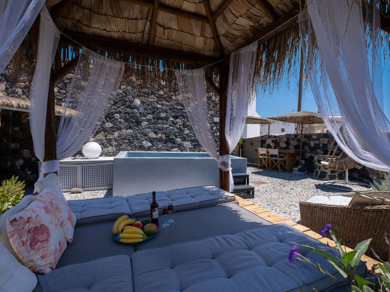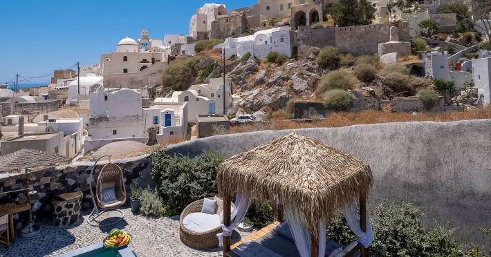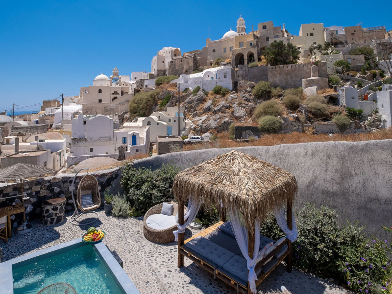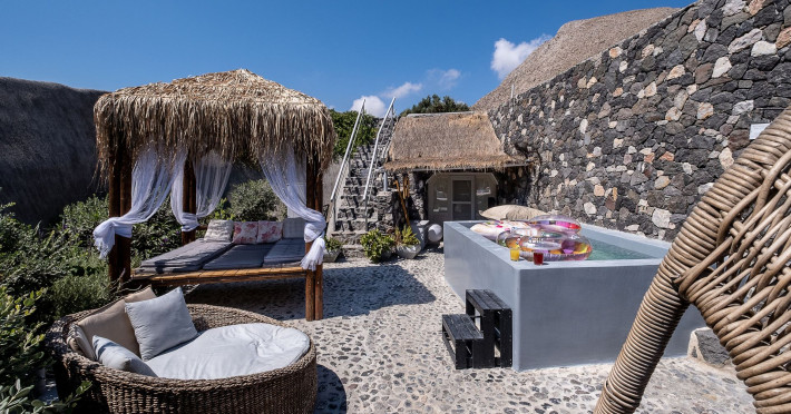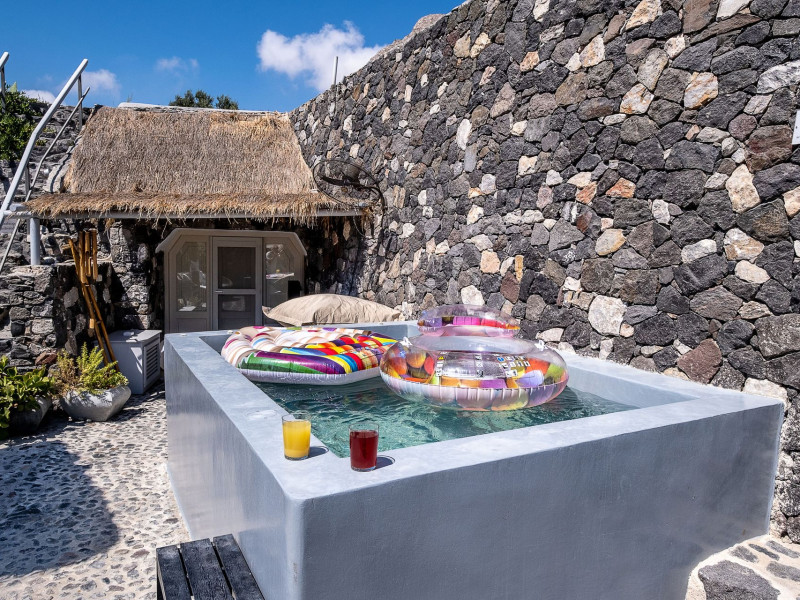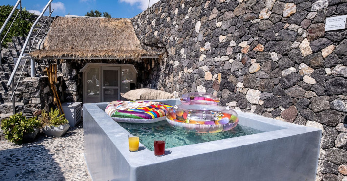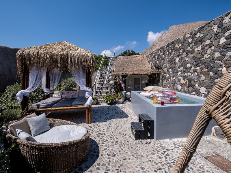 Modern Comfort in a Timeless Cave SettingImpressive 750 SQM: 510 sqm Courtyard + 240 sqm Indoor SpacePrivate Pool & Jacuzzi – Hot Tub Dreaming of the ultimate Santorini escape, whether for a family holiday or a romantic retreat? Welcome to Rock Villas “Legend” and “Myth”, nestled in the enchanting village of Emporio. Here, history, romance, and modern comfort come together in a truly unique setting. Fully renovated with respect to Cycladic architecture, these exceptional cave villas offer luxury, privacy, and tranquility for up to 11 guests, just 12 km from Fira.Welcome to “Legend” and “Myth”, two extraordinary domed cave villas carved into the ancient volcanic rock of Emporio. Designed to blend harmoniously with Santorini’s natural landscape, they reflect traditional Aegean architecture while offering all the comforts of a modern stay. A true highlight is the impressive 750 sq. meter layout, featuring a beautifully equipped 510 sq. meter courtyard—ideal for gatherings—and 240 sq. meters of stylish, spacious indoor living areas. In this luxurious sanctuary, up to 11 guests can unwind in:- 5 Elegant Bedrooms: Relax beneath the iconic domed ceilings, with comfortable double or king-sized beds designed for restful nights.- Lower Rock Yard: Enjoy pure relaxation in the private pool (3x2m), surrounded by cozy lounge corners and unforgettable views of the medieval “Kasteli” castle.- Upper Vistas Yard: Unwind in the jacuzzi – hot tub, let the little ones enjoy their own play area, and gather for al fresco dining with a grill, spectacular views of the castle, and a glimpse of the sea.- 2 Living Rooms: Perfect for downtime, featuring 2 PS4 consoles, HDTV with Netflix, books, and board games for everyone to enjoy.- 2 Fully Equipped Kitchens: Ideal for home cooking and shared meals, with dining space for up to 20 guests in total. Your comfort is our priority, with natural and technical ventilation throughout, complemented by six air conditioners to ensure a pleasant stay. Families are especially welcome — from baby cots and high chairs to a baby bath, we’ve included everything you may need to keep your little ones happy and comfortable. SANTORINI ADVENTURES"An idyllic location with stunning scenery, peaceful and relaxing!""Local stores are about a 10min walk." Enhance your stay with exclusive experiences available upon request:- Adventure Seekers: Discover Santorini from the sea with unforgettable sailing cruises. Choose between traditional caiques, catamarans, or yachts — or rent a car and explore the island at your own pace.- Relax & Rejuvenate: Enjoy massage therapies and facial treatments from skilled professionals, right in the comfort of your villa.- Mind & Body: Reconnect with yourself through private aqua yoga classes and meditation music sessions, designed to bring balance and deep relaxation. Eager to explore Santorini on your own? Here are our top recommendations:- Emporio Village & Kastelli: Just a 2-minute walk away, discover a medieval castle settlement with Byzantine chapels, winding alleys, and a timeless local atmosphere.- Black Beaches: Only a 7-minute drive to Aghios Georgios, Perissa & Perivolos, where you can experience Santorini’s famous volcanic sand and vibrant beach vibe.- Fira: Around 25 minutes away, the lively heart of Santorini, offering breathtaking caldera views, shopping, and an endless choice of restaurants and cocktail spots.- Megalochori: A charming village only 8 minutes away, known for its whitewashed alleys, blue-domed churches, and some of the island’s best wineries — perfect for a memorable wine tasting.- Pyrgos: A beautiful hilltop village just 10 minutes away, surrounded by vineyards and offering panoramic views across the entire island.- Vlychada: Only 9 minutes away, with dramatic volcanic cliffs, a picturesque marina, the Tomato Industrial Museum, and unforgettable horse riding experiences nearby.- Akrotiri: Visit the famous archaeological site and explore the rich history of Santorini through one of the most important prehistoric settlements in the Aegean.- Volcano: Take a boat trip to the volcanic island, walk through its unique landscapes, and experience Santorini’s iconic hot springs. We’re here to make your stay truly memorable — from arranging a sunset cruise to sharing hidden gems only locals know.Explore our photos to get a closer look at the inviting details and unique atmosphere of the property. The home is yours to enjoy, with full access to all appliances and amenities for a comfortable, effortless stay.Hot tub heating is available upon request with an additional charge of €45 per day during the operating season (May to October). Please let us know at least 48 hours before check-in so we can have everything prepared for your arrival.Seasonal operation: The pool and jacuzzi operate from May to October, depending on weather conditions.We’re always happy to assist you whenever needed — available from 10am to 6pm for services and 24/7 for any emergencies. Make your stay a stress-free experience by following our house rules:-Check-in time is 3PM–10PM and check-out time is before 11AM, so we can prepare everything perfectly for the next guests.- We warmly welcome one pet up to 8kg. Your furry friend will feel right at home — a pet basket and accessories are provided for their comfort.- To keep the indoor spaces fresh and comfortable for everyone, smoking (including vaping and e-cigarettes) is allowed outdoors only.- Please refer to the “Additional Rules” section under the “Things to Know” heading for the complete overview of our house rules, so everything is clear before arrival. The property is approved by the Greek National Tourism Organization - Registration number: ΕΣΛ-1053955Modern Comfort in a Timeless Cave SettingImpressive 750 SQM: 510 sqm Courtyard + 240 sqm Indoor SpacePrivate Pool & Jacuzzi – Hot Tub Dreaming of the ultimate Santorini escape, whether for a family holi