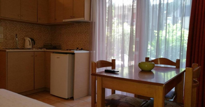 Facilitati camere: Cele 28 de camere sunt toate dotate cu grup sanitar propriu, mobila noua, chicineta, minifrigider, fierbator, seif, uscator de par, TV satelit, telefon, aer conditionat, balcon cu vedere spre gradina sau spre mare. La cerere se ofera patut de bebelus (contra cost).