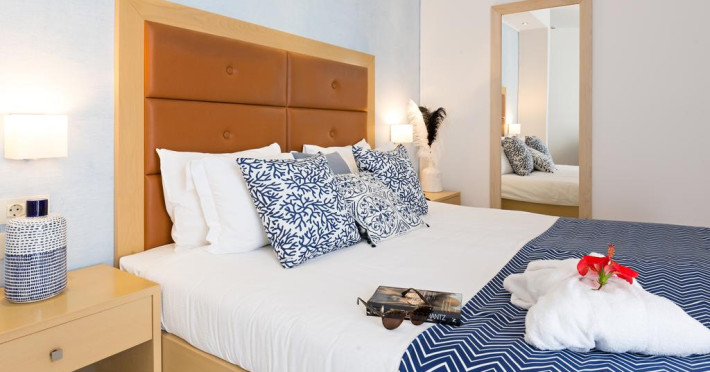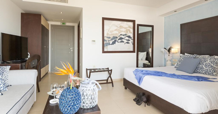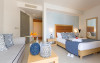 Sunt disponibile 190 camere. În camere există baie cu cadă sau duș, foehn, articole de toaletă gratuite, precum și halate de baie și papuci. Fiecare cameră dispune de un aparat pentru preparare cafea sau ceai, cană-fierbător și minibar. Oaspeții pot solicita serviciul de room service pentru a servi masa sau diverse băuturi. Unele camere au balcon cu vedere la mare sau la piscină. Camerele confortabile de la Royal Blue Resort & Spa au pardoseală de gresie/ marmură, aer condiționat, Tv cu canale prin satelit și seif. Oaspeții au acces gratuit la serviciul Wi-fi în camere. Curățenia in cameră se face zilnic. Anumite camere au cadă cu hidromasaj care asigură un plus de confort și răsfăț. Proprietatea oferă camere pentru familie cu o suprafață mai mare și un număr mai mare de paturi față de cele standard.