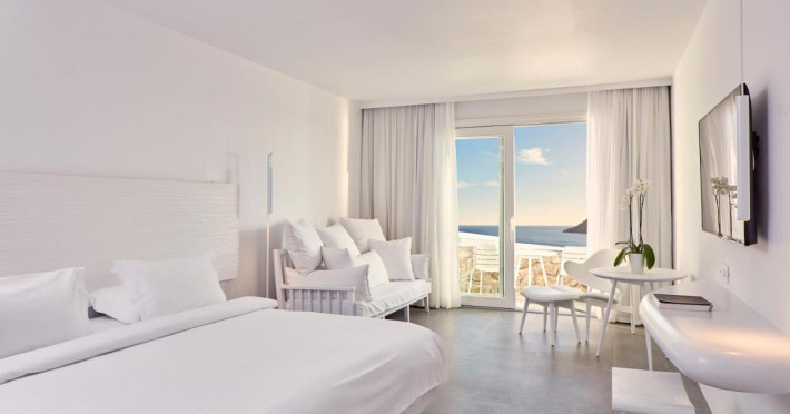 Camerele elegante de la Royal Myconian au zonă de relaxare, TV LCD și DVD/CD player, iar camerele și suitele au și piscină privată sau cadă cu hidromasaj. Serviciul de menajeră este oferit de 2 ori pe zi.