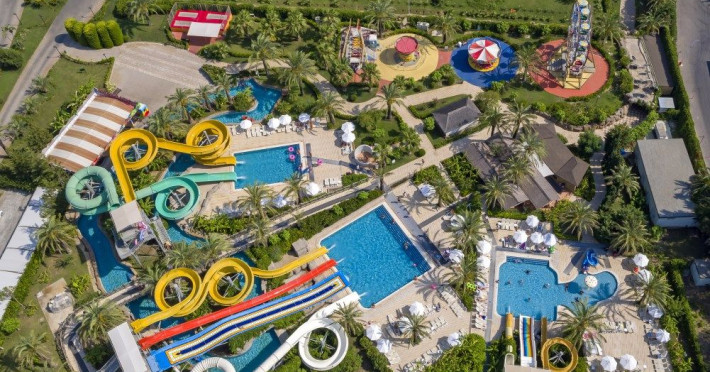 Piscina exterioara de 5840 mp, piscine interioare de 360 mp pentru adulti si pentru copii, 3 tobogane, sezlonguri, umbrele si saltele gratuit.