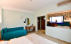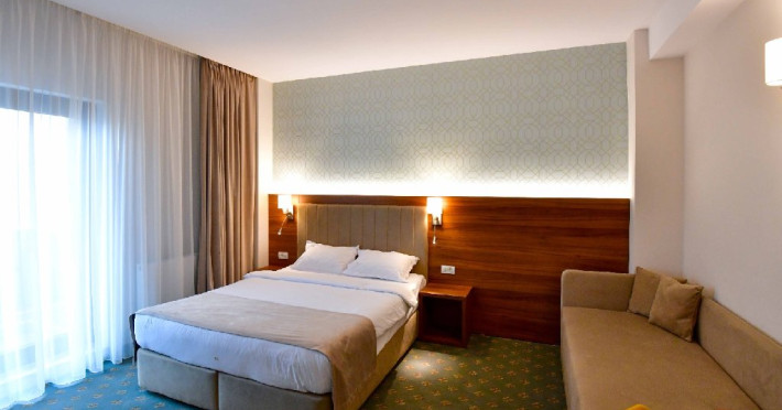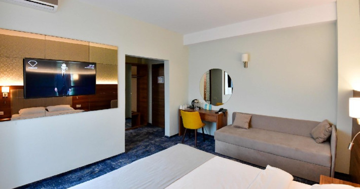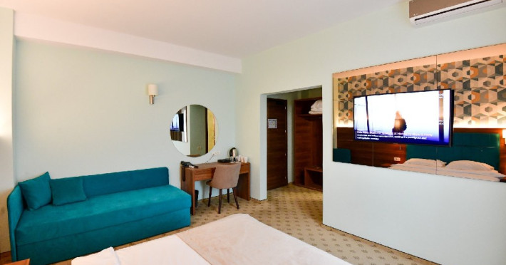 Camera tripla, cu o suprafata de 25 mp, detine un pat extra-large si canapea fixa de o persoana, balcon cu vedere la curtea interioara, baie cu dus, articole de toaleta, TV, AC, internet, minibar, seif, uscator de par. Poate acomoda 2 adulti + 2 copii ( primul copil cu varsta de 0-11.99 ani, iar al doilea copil de orice varsta) sau 3 adulti + 1 copil ( 0-11.99 ani).