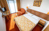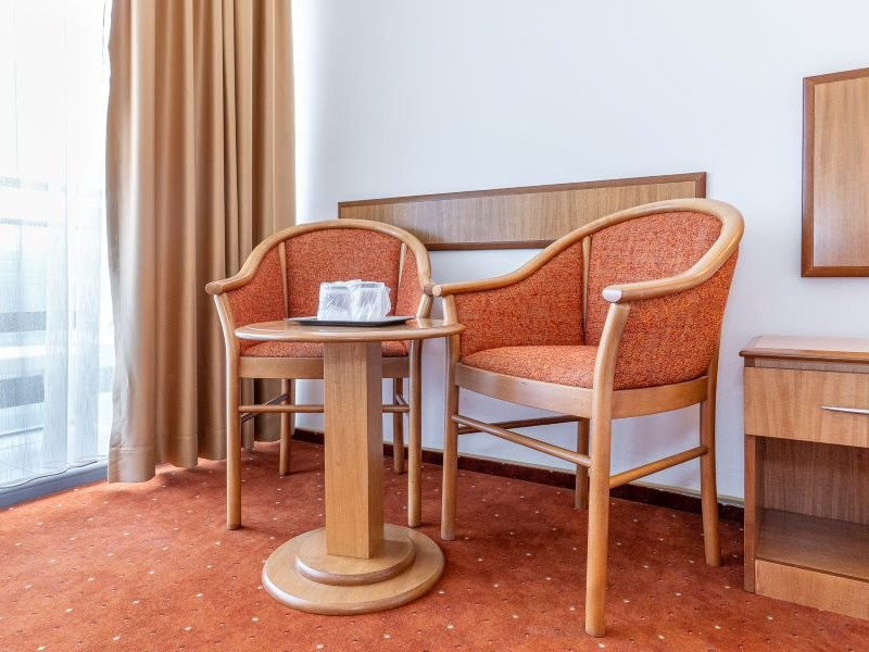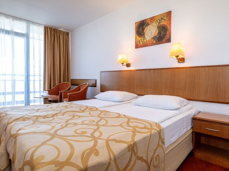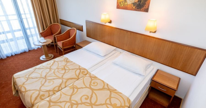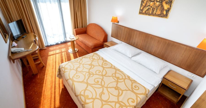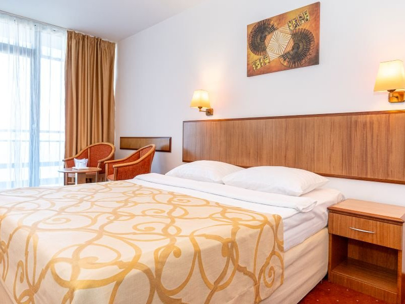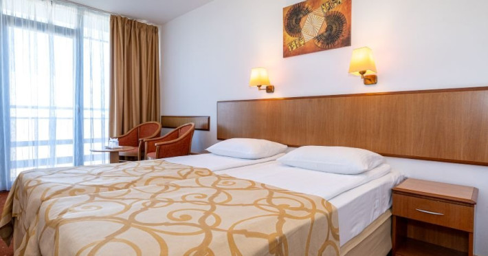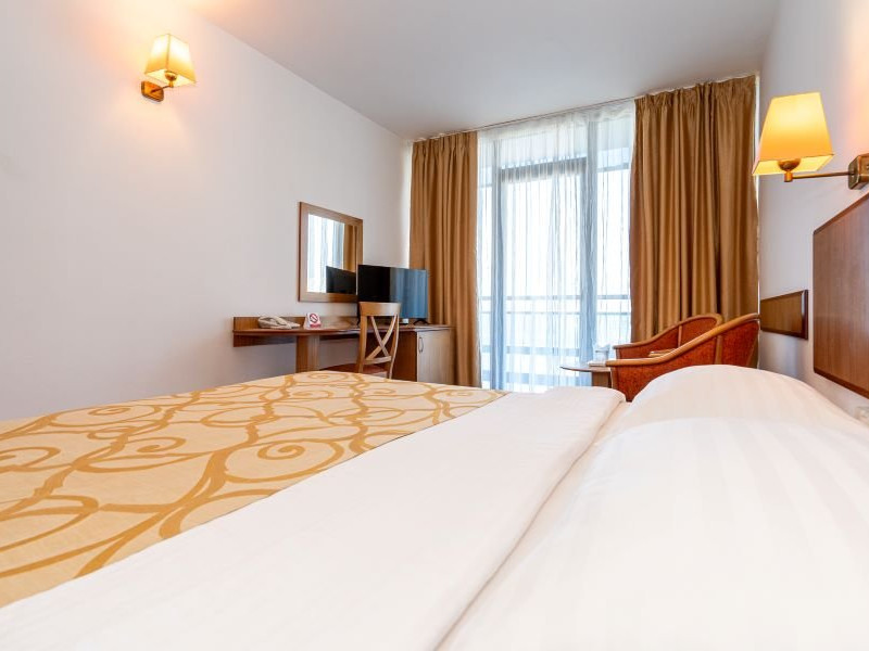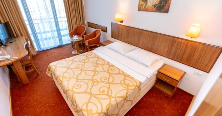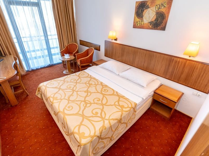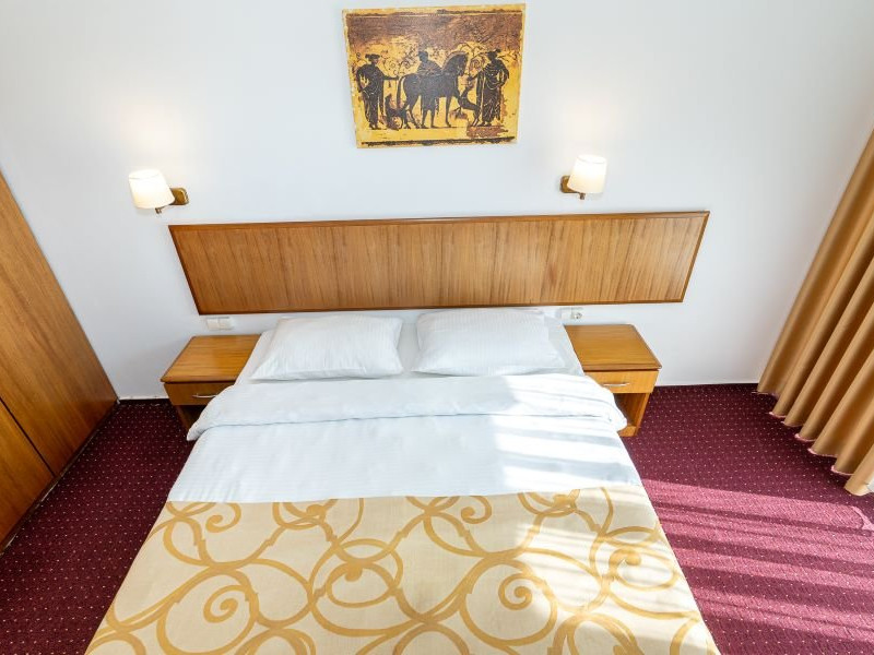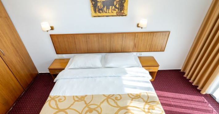 Camera dubla matrimoniala cu o suprafata 15 mp, are pat matrimonial (160/200 cm), acces in camera pe baza de cartela, baie cu canina de dus, uscator par, cosmetice hoteliere, TV, AC, telefon, seif, balcon cu mobilier pe terasa, telefon.
