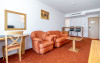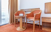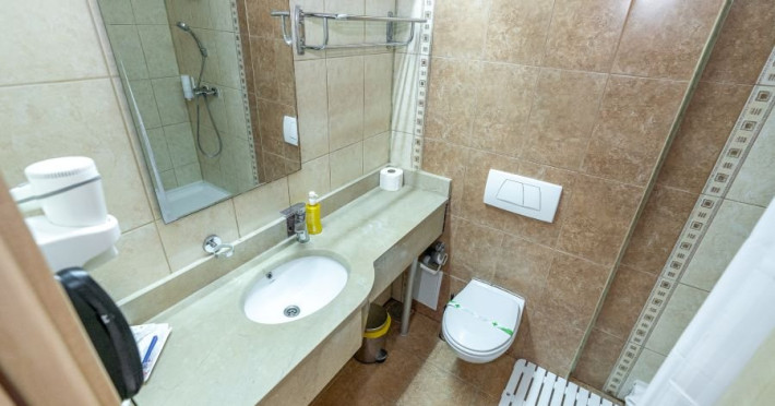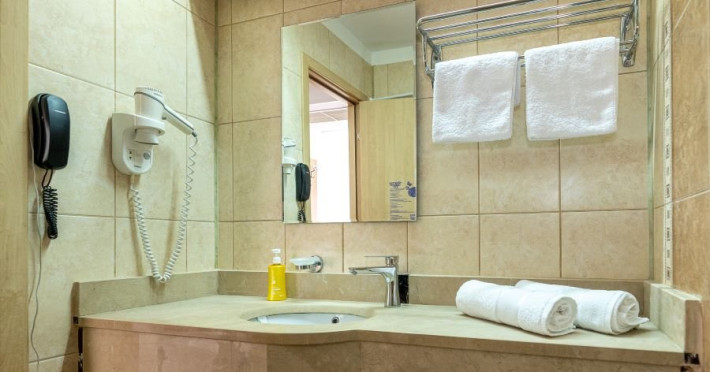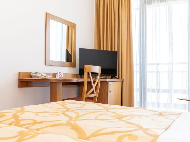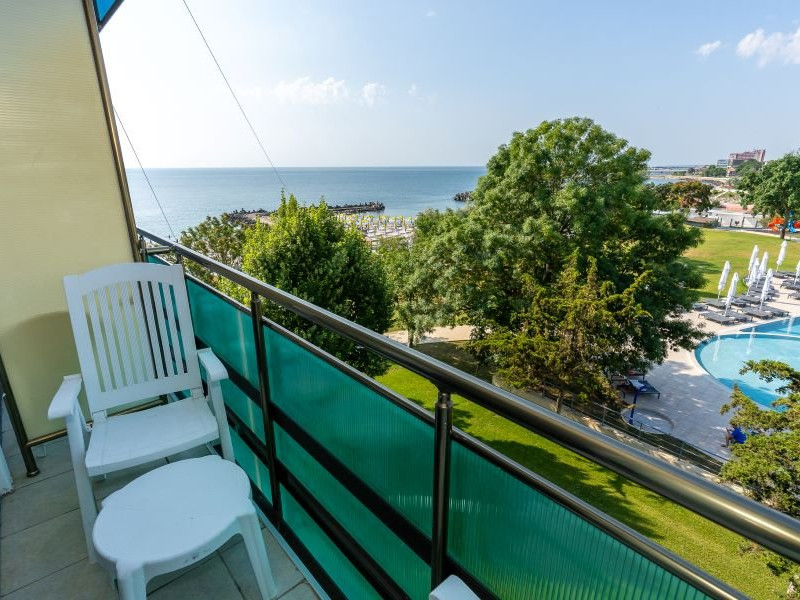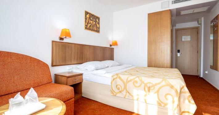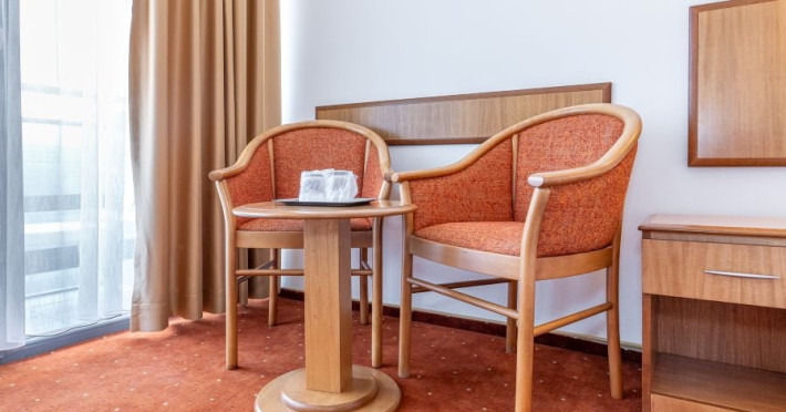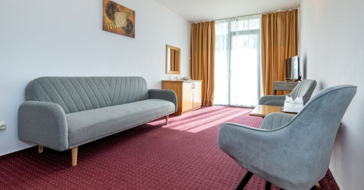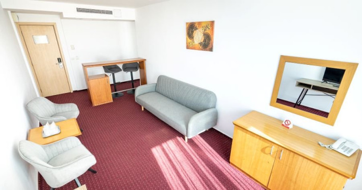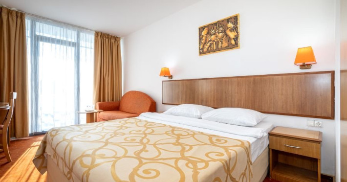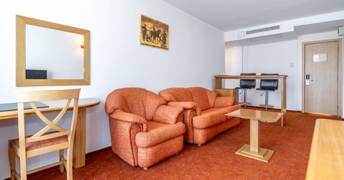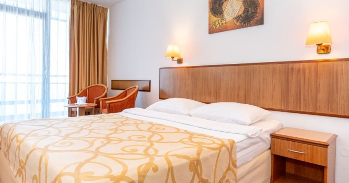 Apartament cu o suprafata de 25 mp, are dormitor cu pat matrimonial si living cu canapea extensibila, o singura baie cu cada, uscator de par, acces in camera pe baza de cartela, baie cu dus, uscator par, cosmetice hoteliere, TV, AC, telefon, seif, balcon cu mobilier pe terasa.