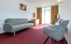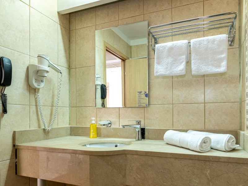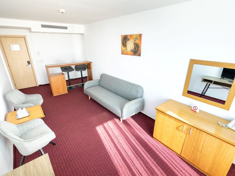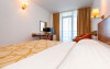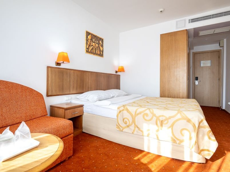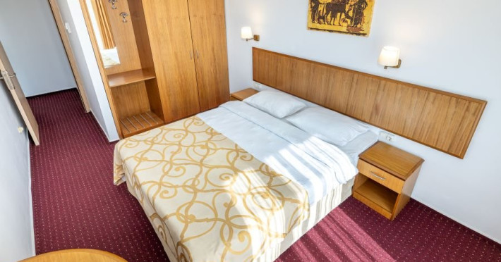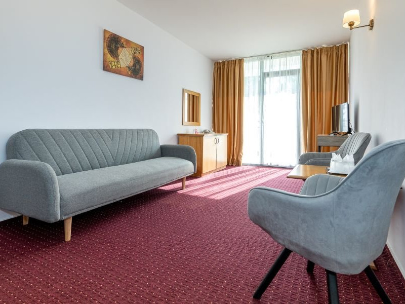 Camera dubla King cu o suprafata de 15 mp, are un pat matrimonial (160/200 cm) si o canapea extensibila pentru o singura persoana, acces in camera pe baza de cartela, baie cu dus, uscator par, cosmetice hoteliere, TV, AC, telefon, seif, balcon cu mobilier pe terasa, telefon.