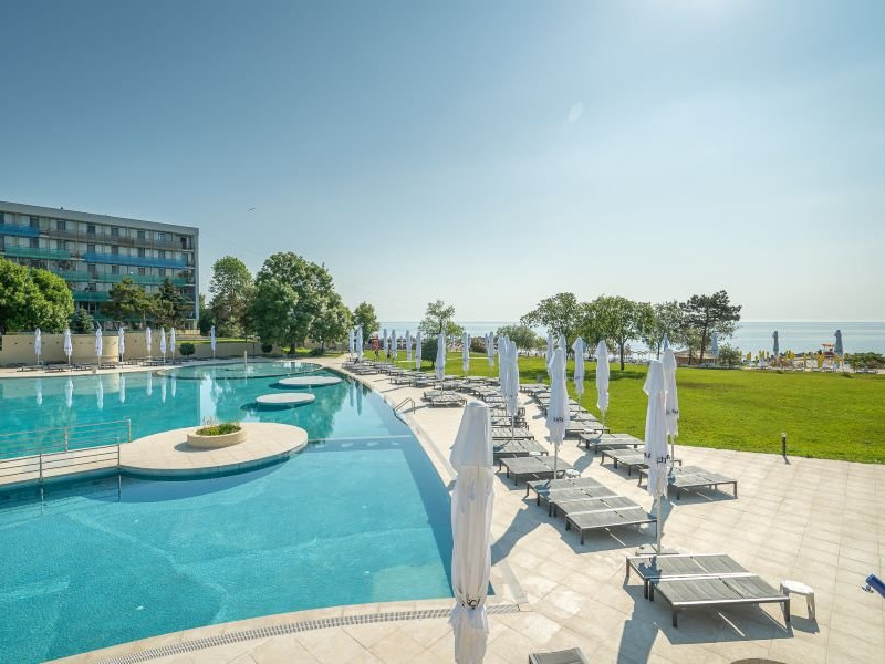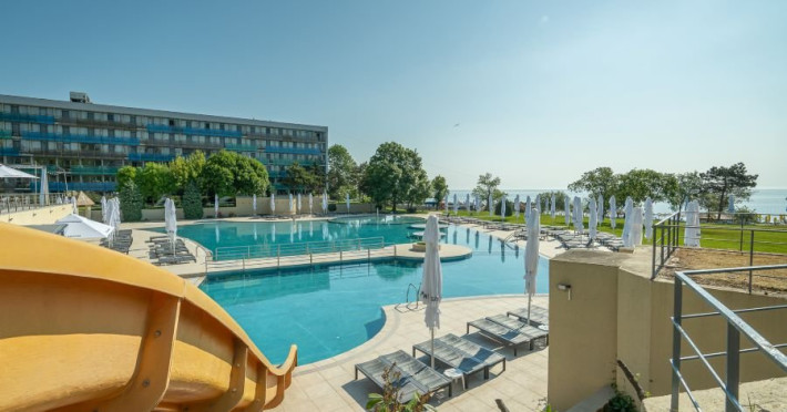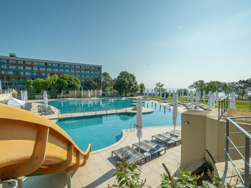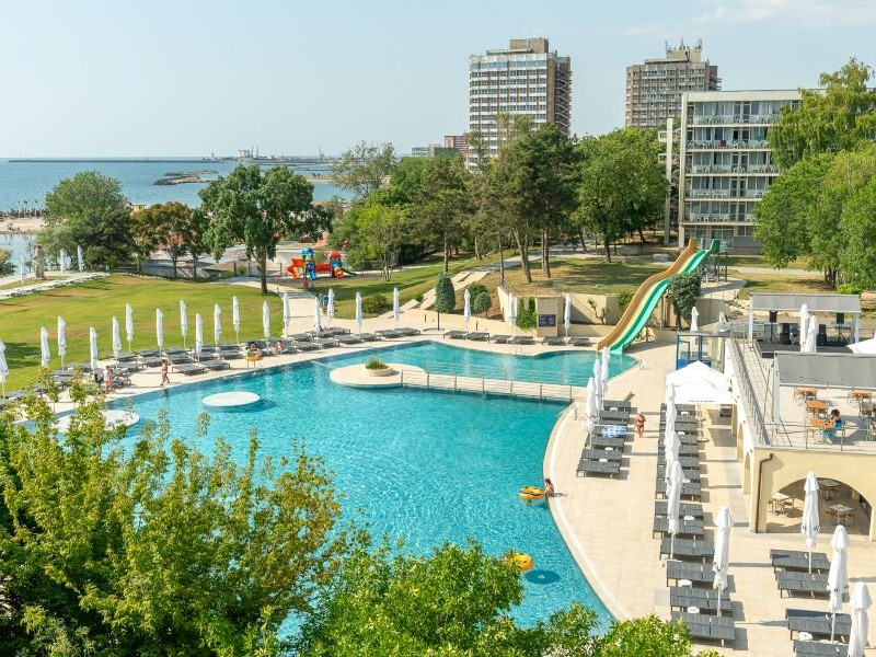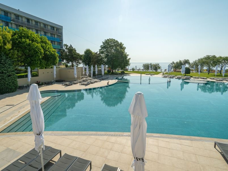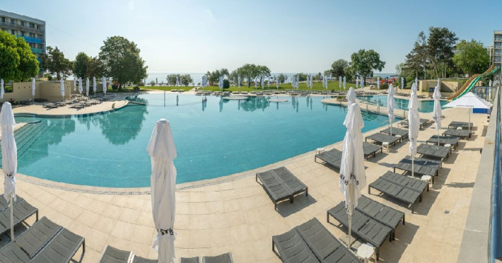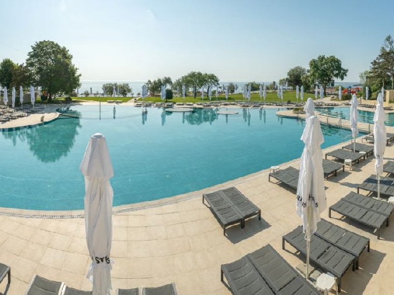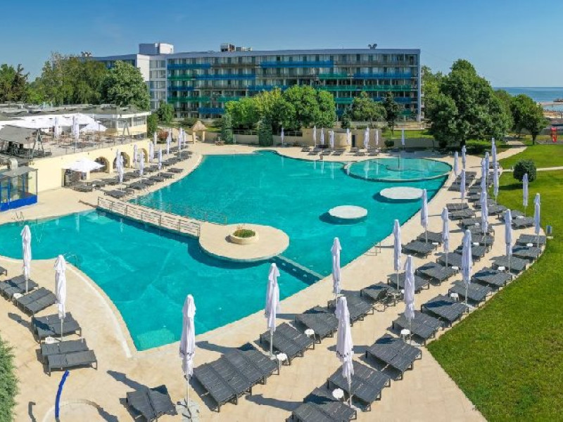 Plaja privata cu sezlonguri si umbrela gratuite, in limita disponibilitatii.SAFIR BLUE RESORT situat in statiunea Saturn, la aproximativ 50 m de plaja, este alcatuit din doua hoteluri Cleopatra 3* (277 camere) si Narcis 3* ( 320 camere), cele doua hoteluri dispun de o curte comuna cu o suprafata de peste 10.000 mp, o piscina generoasa de peste 1500 mp, precum si de o plaja privata de peste 5000 mp.