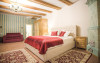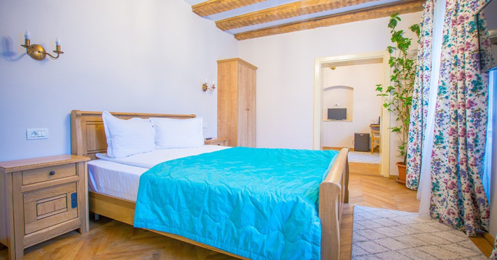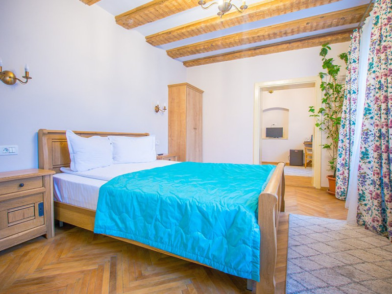 - Camera Queen. Aceasta camera, situata la etajul 1 iti ofera un spatiu generos de 35 de metri patrati, atent decorat si utilat cu un pat queen size cu saltea profesionala, cada, masuta de cafea si un divan confortabil. Camera Queen este singura din proprietate cu iesire pe un balcon cu vedere spre centrul orasului.