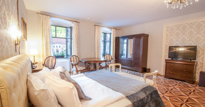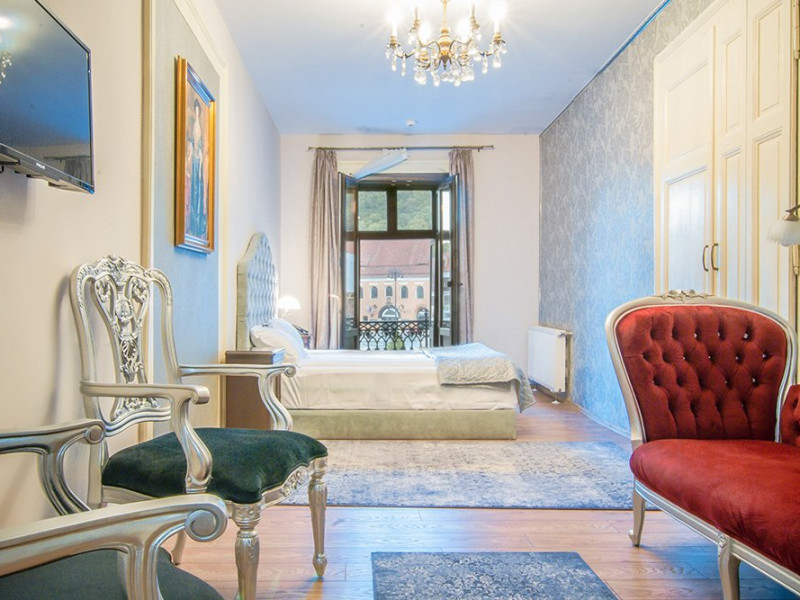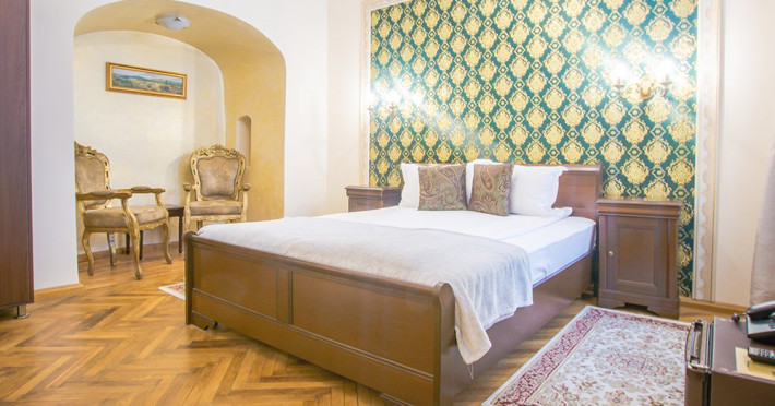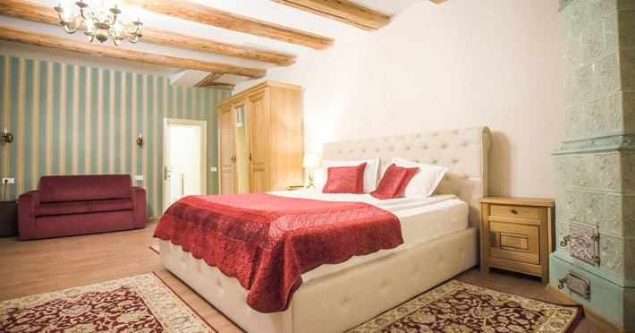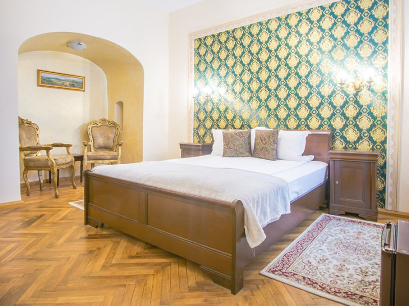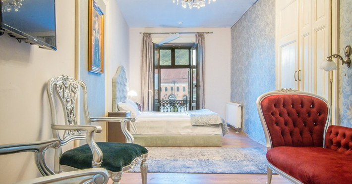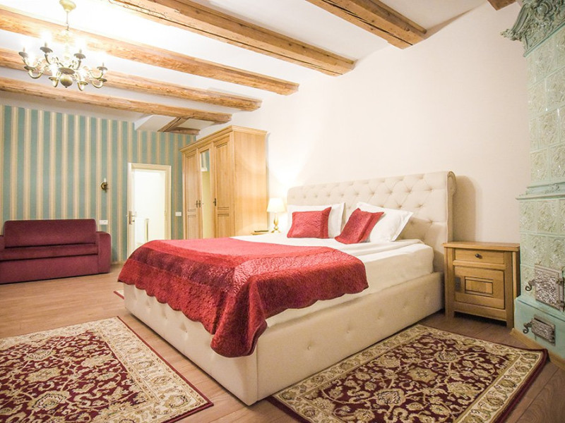 - Probabil cele mai mari camere duble pe care le vei gasi in centrul orasului, camerele King sunt de departe cele mai solicitate din intreaga proprietate. Pe langa decorul aparte, mobilierul atent selectionat si dotarile moderene, aceste camere se remarca prin parchetul cu intarsii cu 4 tipuri de lemn (fag, stejar, nuc, trandafir) si sobele cu placi de teracota pictata. Patul king size, canapeaua, masa si scaunele stil completeaza atmosfera de sfarsit de secol 19 ce domina intreg spatiul. Pentru aceia care isi doresc rasfatul unui rege aceasta camera este alegerea ideala, oferind o priveliste superba asupra Pietei Sfatului si muntelui Tampa. Aceste camere sunt situate la etajul 1 si 2.