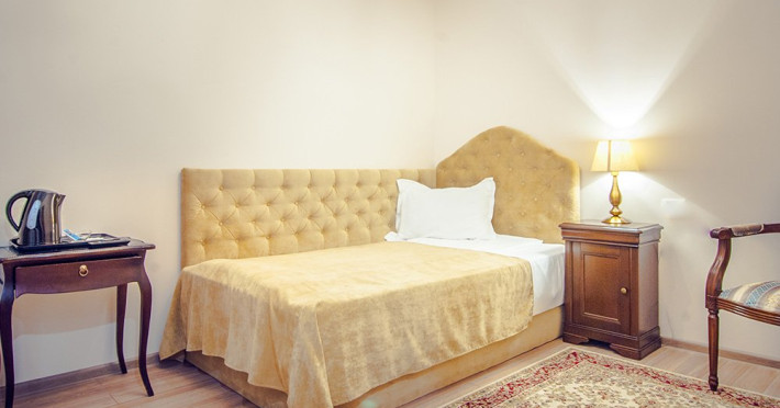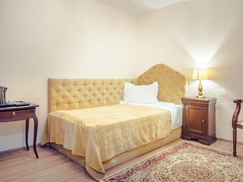 - Camere single. Situate la parter, cu acces direct din curtea interioara aceste camere cu o suprafata de 15 mp sunt dotate cu un divan cu saltea profesionala, cabina de dus spatioasa si birou generos.